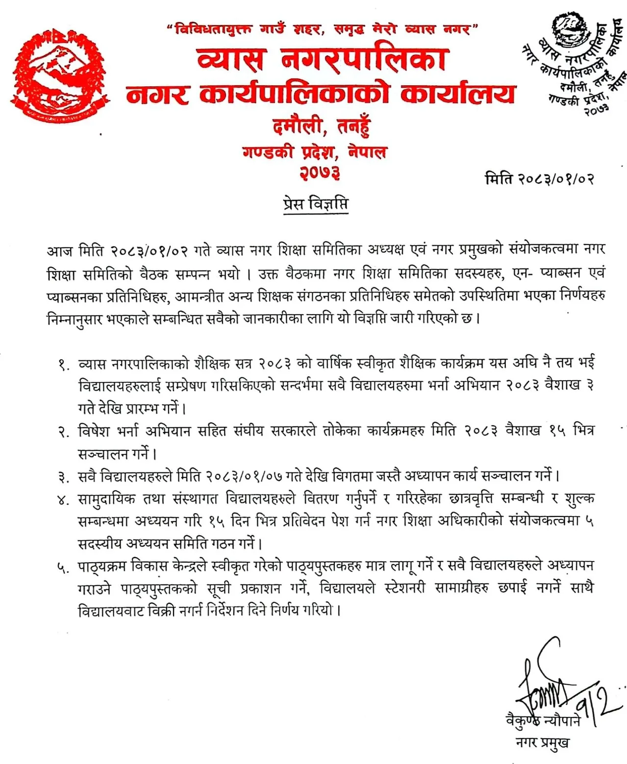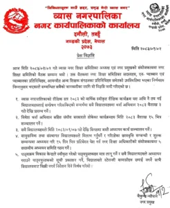 तनहुँ । बैशाख २ व्यास नगरपालिकामा बैशाख ७ गतेबाट नियमित रुपमा पठनपाठन सुरु हुने भएको