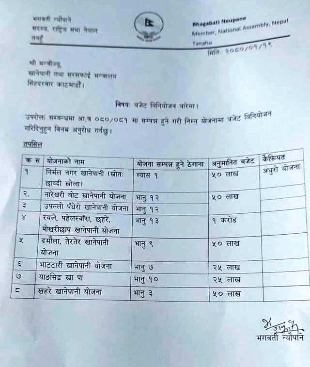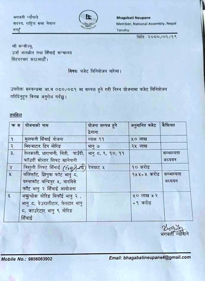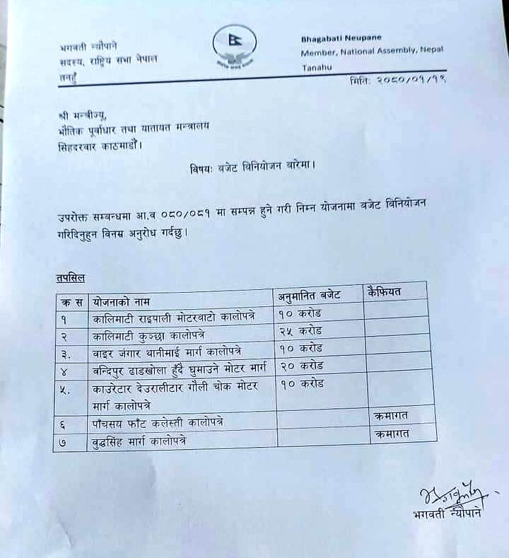 राष्ट्रिय सभाकी सांसद भगवती न्यौपानेले तनहुँ जिल्ला क्षेत्र नम्बर १ का विभिन्न योजनाको लागि विभिन्न मन्त्रालयमा बजेट विनियोजन गर्न माग गरेकी छन् । सांसद न्यौपानेले मंगलबार संघीय सरकारको भौतिक पुर्वाधार तथा यातयात मन्त्रालय, उर्जा जलश्रोत तथा सिंचाई मन्त्रालय र खानेपानी तथा सरसफाई मन्त्रालयमा छुट्टाछुट्टै निबेदन पेश गरि विभिन्न योजनाहरुमा बजेट माग गरेकी हुन् ।
