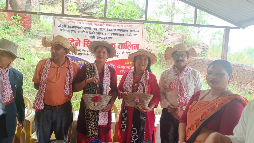 बन्दिपुर गाउँ पालिकाले महिलाहरुलाई मकैको खोस्टा र थाकलको पातबाट हस्तकलाको सामाग्री निर्माण गर्ने तालिम दिएको छ । ‘स्थानीय श्रोत र साधन, रोजगारी सिर्जनाको प्रमुख आधार’ भन्ने मुल नाराका साथ गरिबी निवारणकालागि लघु उद्यम विकास कार्यक्रम अन्तर्गत वडा नम्बर १ र ४ का २० जना महिलाको लागि ३० दिने मकैको खोस्टा र थाकलको पातबाट हस्तकलाका सामाग्री निर्माण गर्ने तालिम सम्बन्धि तालिम दिईएको थियो । उक्त तालिमको बुधबार समापन गरियो ।