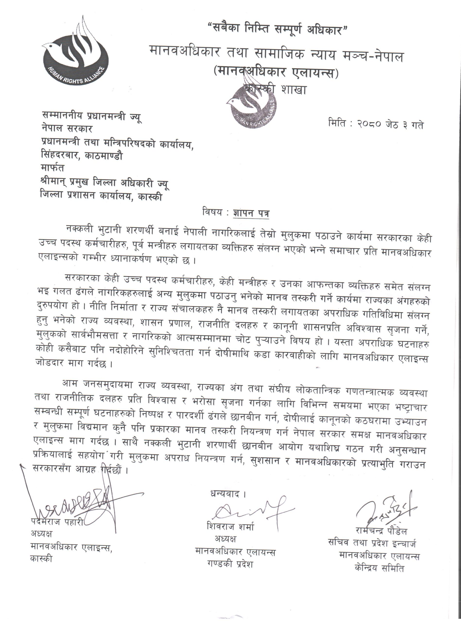 उक्त ज्ञापनपत्रमा मानवअधिकार एलायन्सका केन्द्रिय सचिव रामचन्द्र पौडेल, गन्डकी प्रदेशका अध्यक्ष शिवराज शर्मा र कास्की जिल्ला अध्यक्ष पदमराज पाहारीले हस्ताक्षर गरेका छन् ।