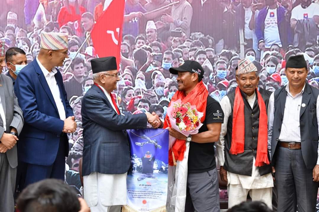 दुबै खुट्टा गुमाएका सगरमाथा आरोही रोल्पाका हरि बुढा मगरलाई आईतवार सम्मान गर्दै नेकपा एमालेका अध्यक्ष केपी शर्मा ओली