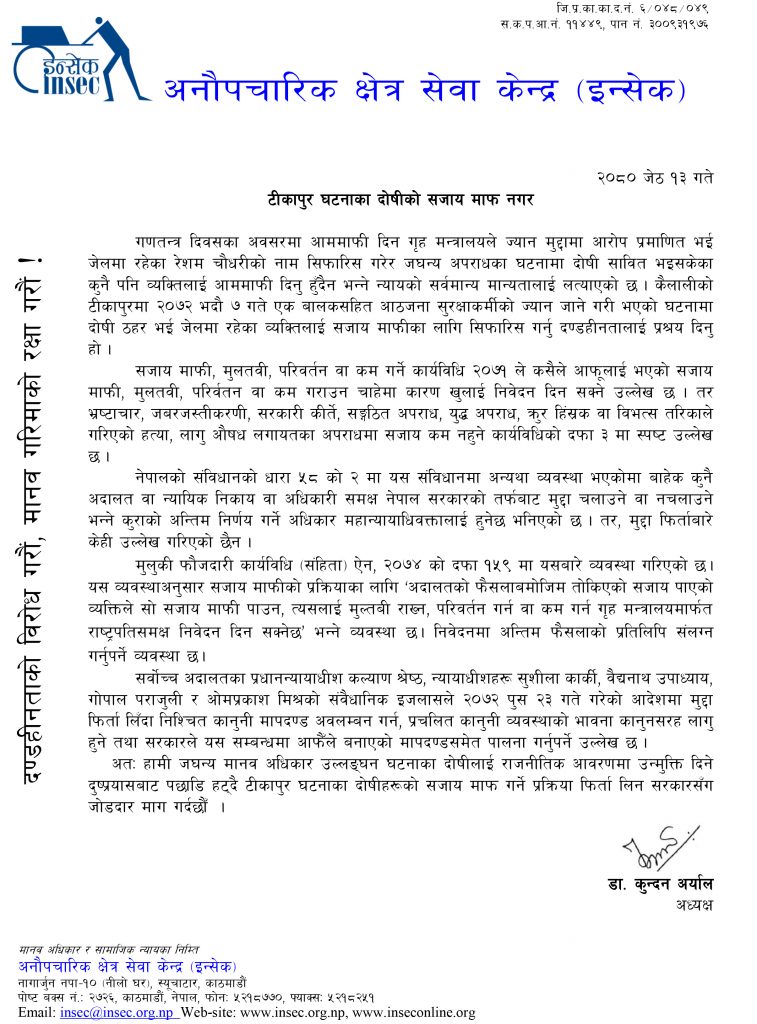 अनौपचारिक क्षेत्र सेवा केन्द्र (इन्सेक) ले गणतन्त्र दिवसका अवसरमा कैलालीको टीकापुर घटनाका दोषी रेशम चौधरीको सजाय माफ गर्न खोजेको घटना प्रति आपत्ती जनाएको छ ।