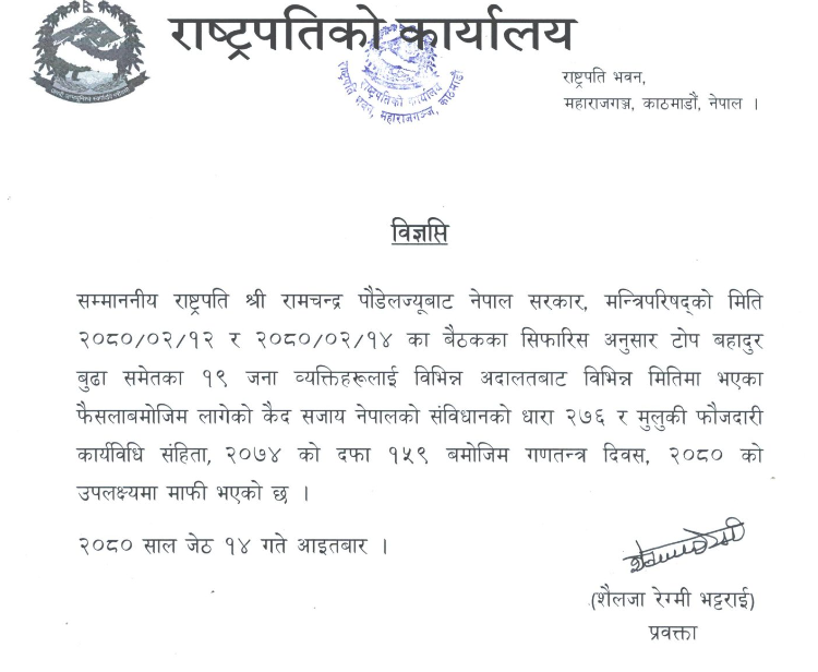 गणतन्त्र दिवसका अवसरमा राष्ट्रपति रामचन्द्र पौडेलले टोपबहादुर बुढासहित १९ जनालाई आम माफी दिएका छन् । त्यस्तै ४८२ कैदीको बाँकी कैद मिनाहा गरिएको राष्ट्रपति कार्यालयले जनाएको छ ।