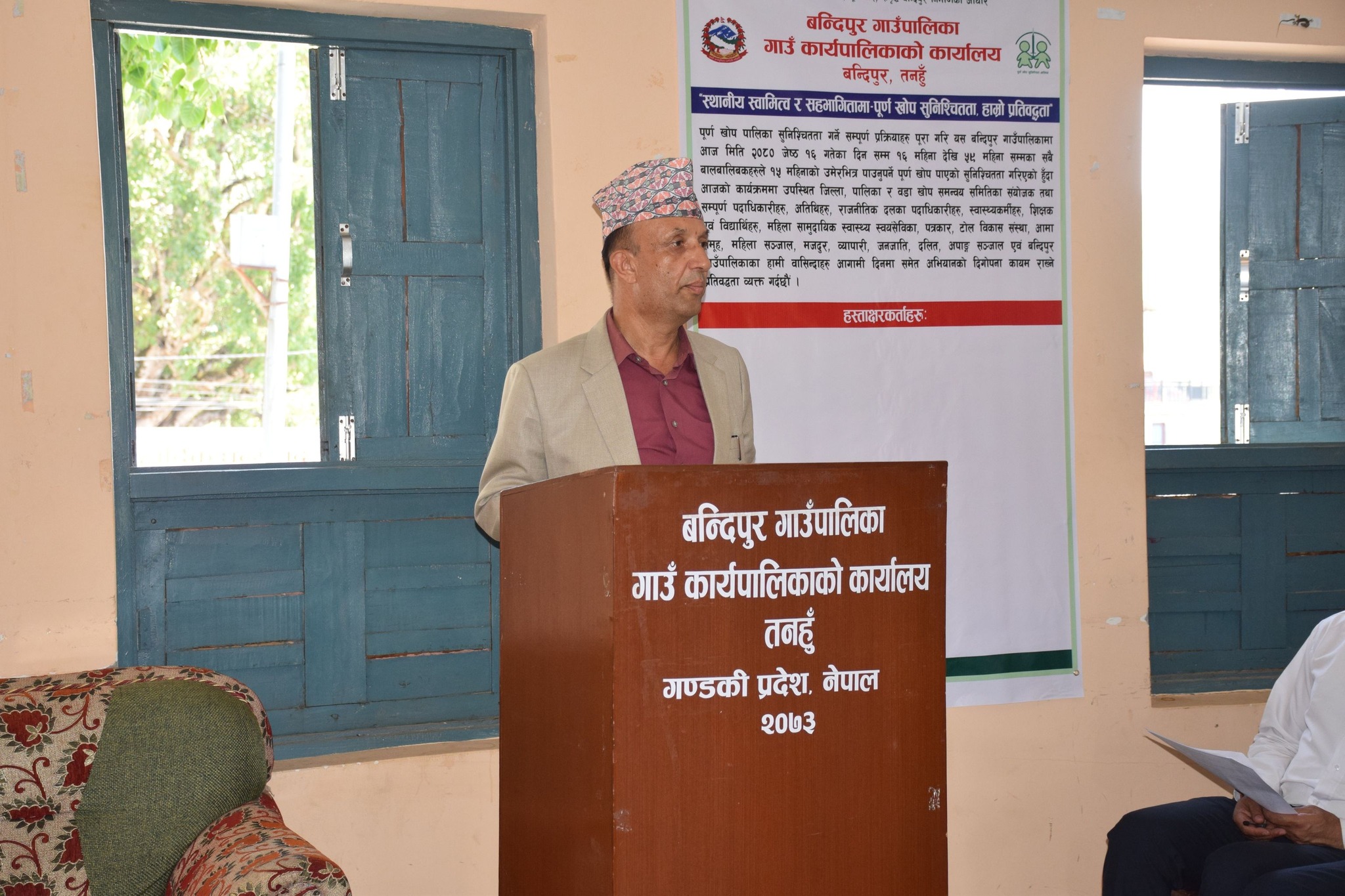 ‘स्थानिय स्वामित्व र सहभागिता पुर्ण खोप सुनिश्चितता हाम्रो प्रतिवद्धता १५ देखी ५९ महिना उमेर भित्र सबै खोप हरु पुरागरी बालबालिकाहरुलाइ रोगबाट सुरक्षित बनाऔं’ भन्ने नाराका साथ सुरु भएको कार्यक्रम बन्दीपुर गाउँपालिका अध्यक्ष सुरेन्द्र बहादुर थापाको अध्यक्षतामा भएको थियो ।