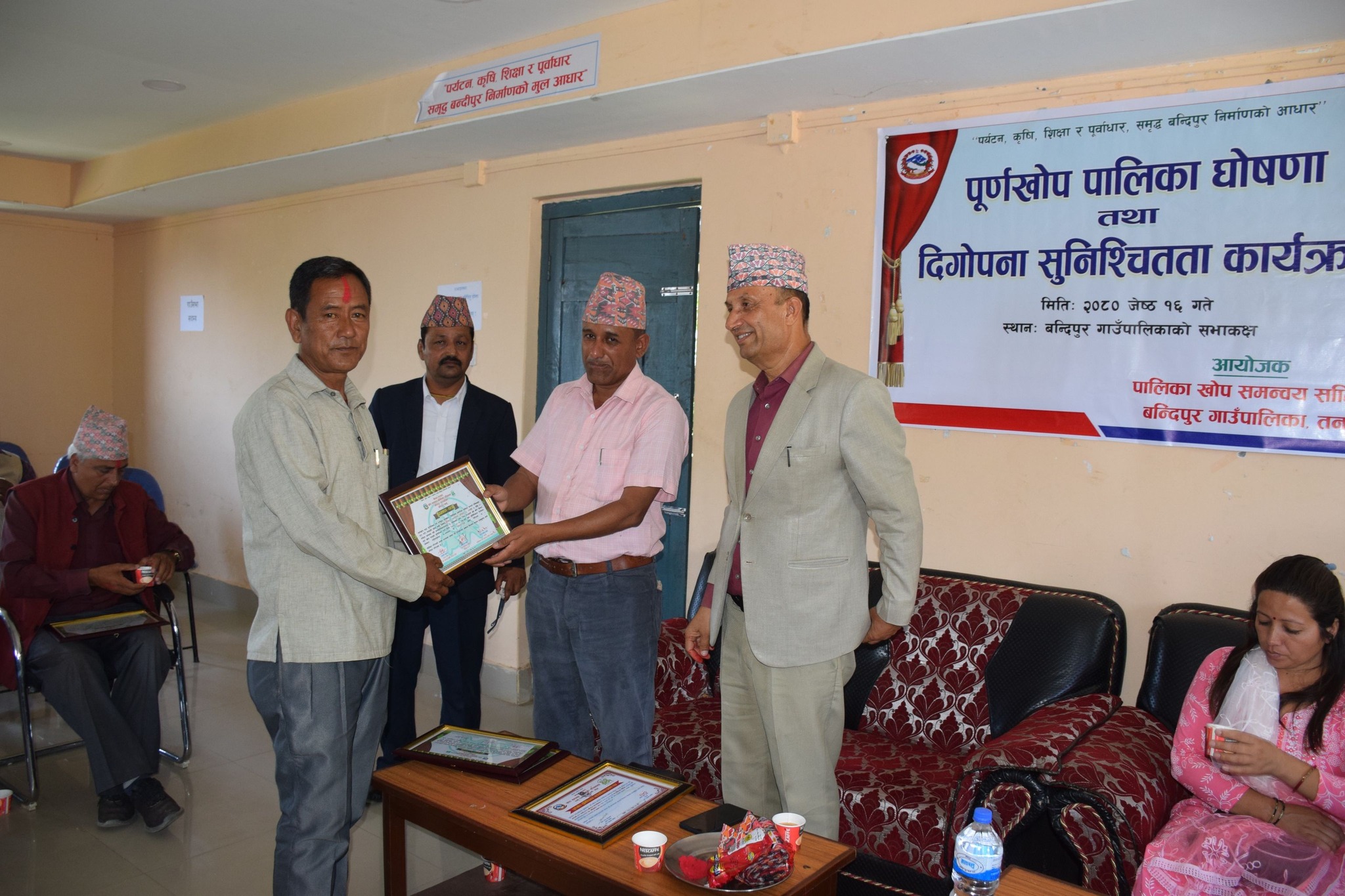 जिल्ला समन्वय समिति तनहुँका प्रमुख शान्तीरमण वाग्लेले गाउँपालिकालाई पूर्ण खोप सुनिश्चितता घोषणा गरिएको प्रमाण–पत्र हस्तान्तरण गरेका थिए । गाउँपालिकाको सवै वडाका अध्यक्षहरुलाइ समेत पूर्ण खोप सुनिश्चितता घोषणा गरिएको प्रमाणपत्र प्रदान गरिएको थियो ।