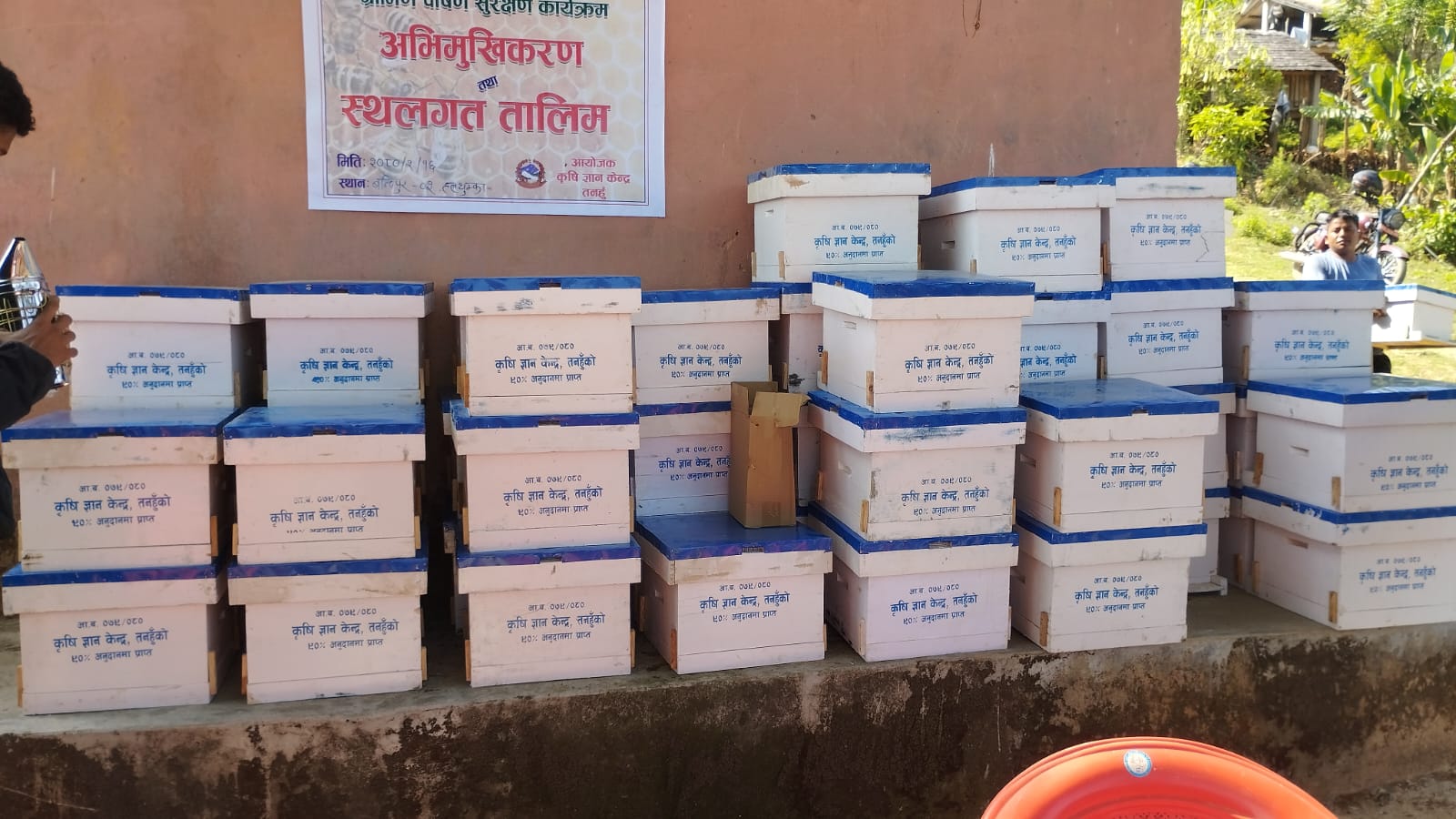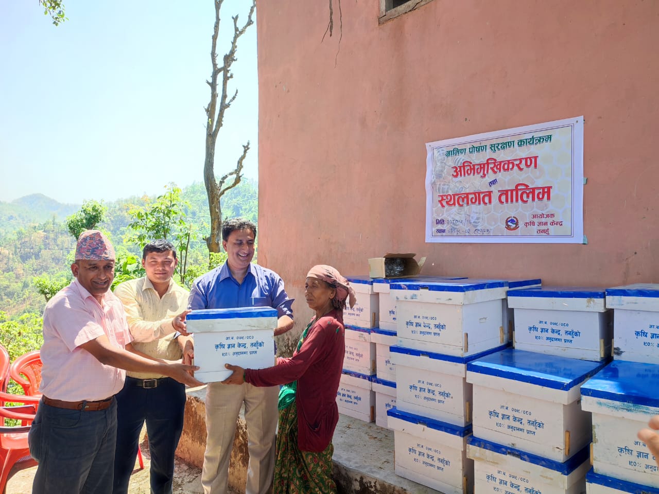 ग्रामिण पोषण सुरक्षण कार्यक्रम अन्तर्गत हल्थुम्काका कृषकहरुलाई मौरी पालन सम्बन्धि तालिम दिएर सो घार निशुल्क उपलब्ध गराईएको कृषि ज्ञान केन्द्र तनहुँका प्रमुख कुलप्रसाद तिवारीले बताए ।
