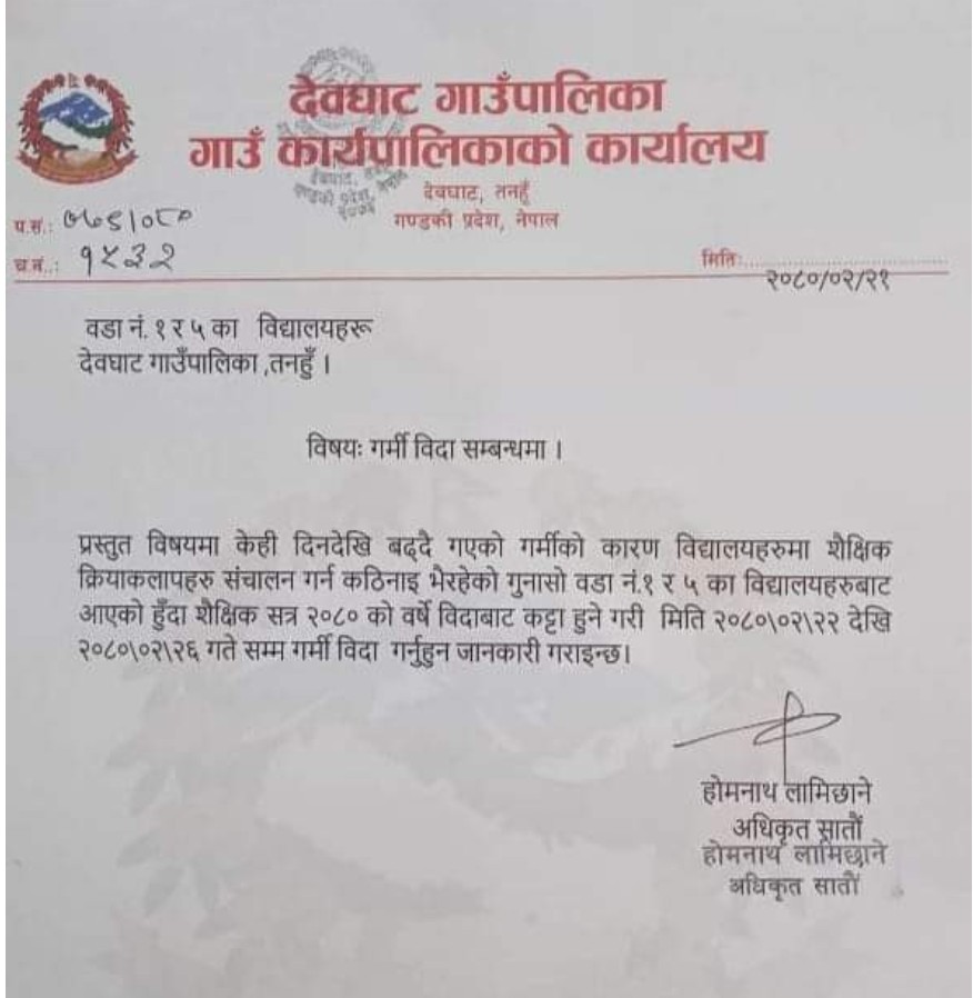 केही दिनदेखि अत्याधिक गर्मीका कारण विद्यालयहरुमा शैक्षिक क्रियाकलापहरु सन्चालन गर्न कठिनाइ भैरहेको गुनासो आएको कारण उक्त दुई वडाका विद्यालयहरुमा शैक्षिक सत्र २०८० को वर्षे विदाबाट कट्टा हुने गरी जेष्ठ २२ गतेदेखि २६ गतेसम्म विद्यालय बन्द गर्ने निर्णय गरिएको देवघाट गाउँपालिका शिक्षा शाखा प्रमुख होमनाथ लामिछानेले जानकारी दिए ।