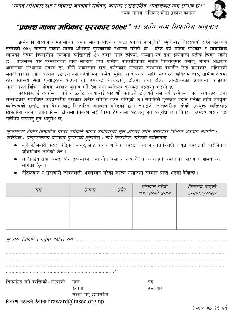 इन्सेकका संस्थापक महासचिव अथक मानव अधिकार योद्धा प्रकाश काफ्लेको स्मृतिमा स्थापित प्रकाश मानव अधिकार पुरस्कारका लागि नाम सिफारिस गर्न इन्सेकले सार्वजनिक आह्वान गरेको छ । मानव अधिकार र सामाजिक न्यायका लागि क्रियाशील व्यक्तिको नाम सिफारिस hraward@insec.org.np मा गर्न सकिने इन्सेकले जनाएको छ ।
