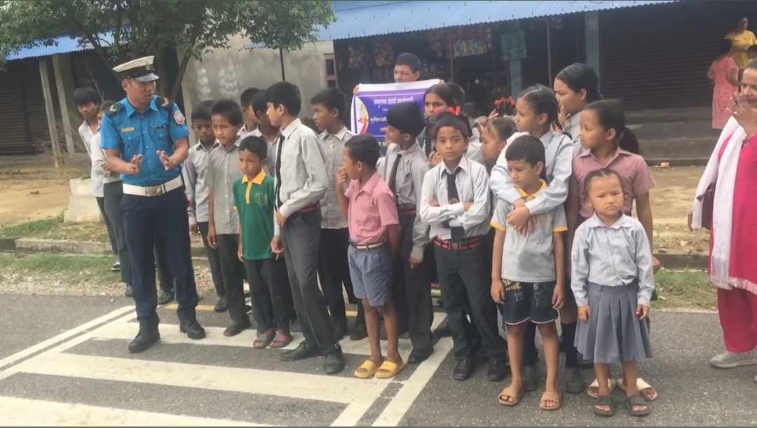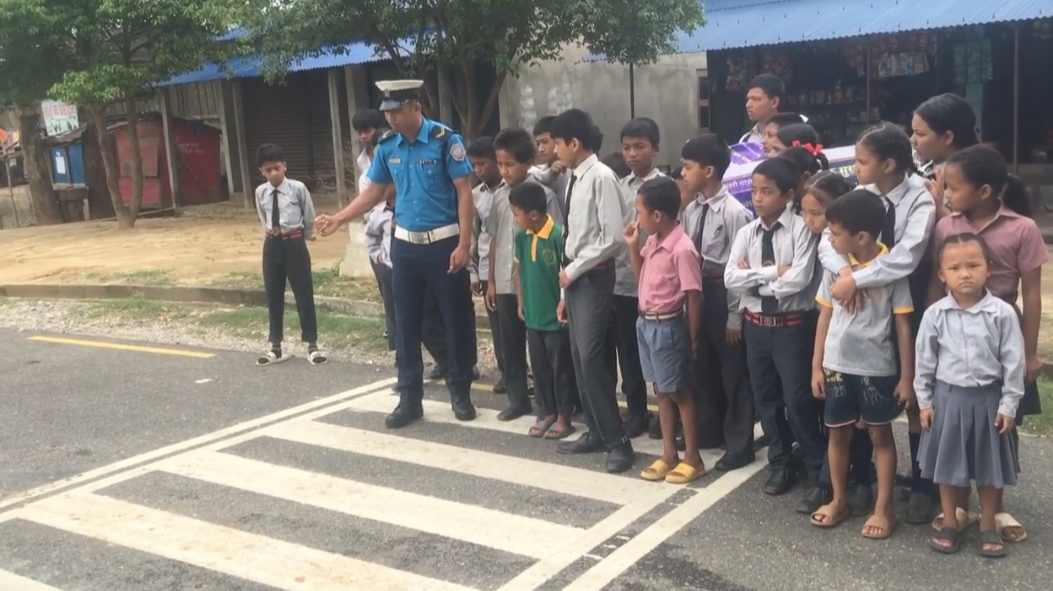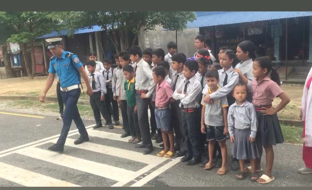 ट्राफिक प्रहरीले ट्राफिक सचेतना कार्यक्रम अन्तर्गत स्कुले विद्यार्थीलाई सुरक्षित तरिकाले जेब्रा क्रसिङबाट बाटो काट्न सिकाएको हो ।