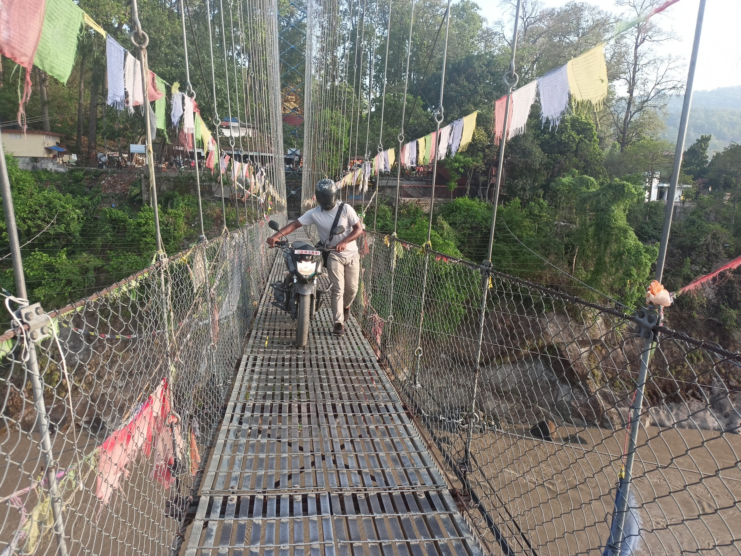 चितवनबाट देवघाट जोड्ने त्रिशूली नदीको झोलुङ्गे पुलमा डोहोर्याएर मोटरसाइकल तार्दै सर्वसाधारण । पक्की पुल नहुदा तथा झोलुङ्गे पुल जिर्ण हुदा उक्त पुलमा मोटरसाइकल डोहोर्याएर मात्र वारपार गर्न पाईन्छ ।