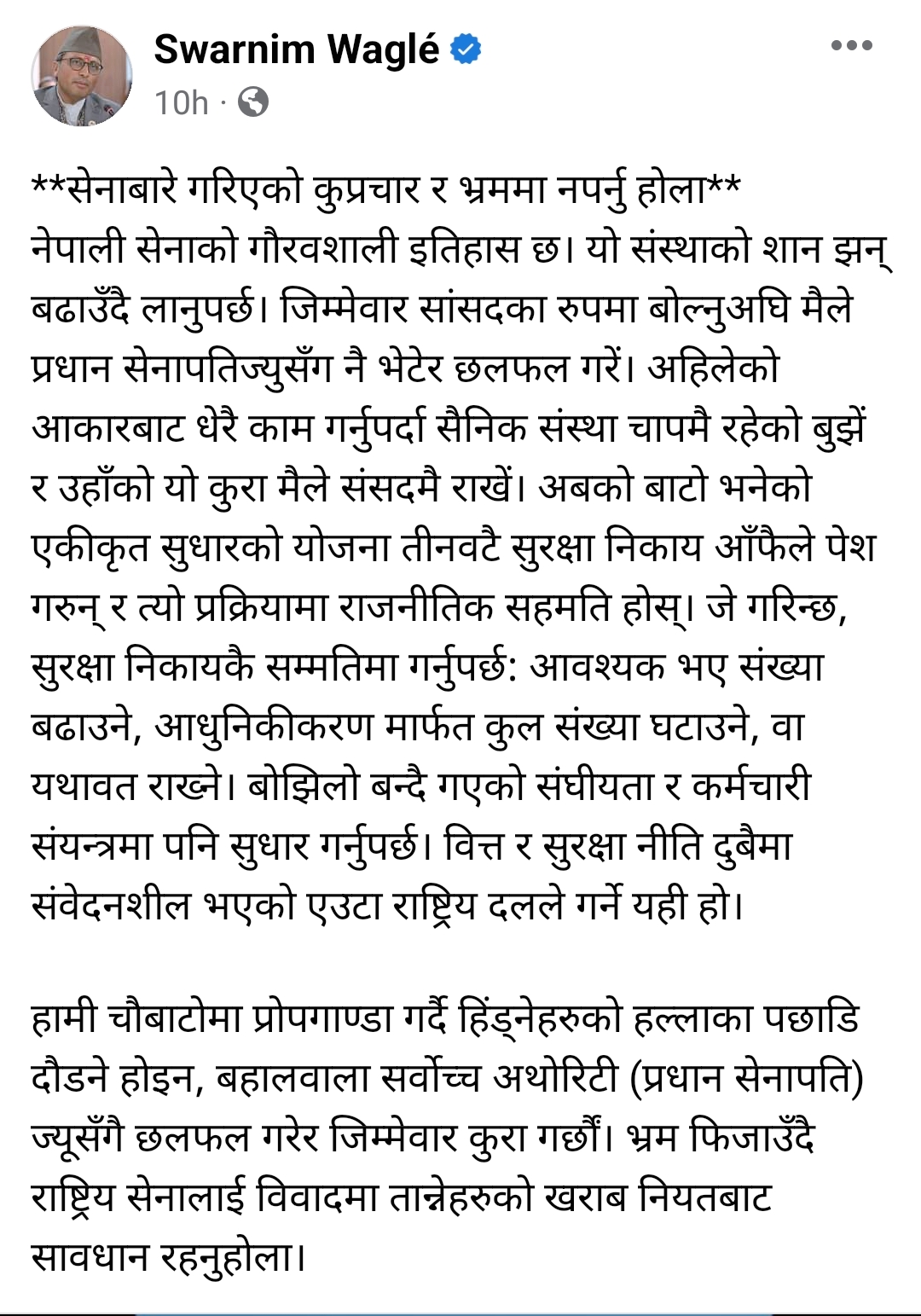 सांसद वाग्लेले सामाजिक सन्जालमा लेखेका छन् ‘नेपाली सेनाको गौरवशाली इतिहास छ । यो संस्थाको शान झन् बढाउँदै लानुपर्छ । जिम्मेवार सांसदका रुपमा बोल्नुअघि मैले प्रधान सेनापतिज्युसँग नै भेटेर छलफल गरें । अहिलेको आकारबाट धेरै काम गर्नुपर्दा सैनिक संस्था चापमै रहेको बुझें र उहाँको यो कुरा मैले संसदमै राखें । अबको बाटो भनेको एकीकृत सुधारको योजना तीनवटै सुरक्षा निकाय आँफैले पेश गरुन् र त्यो प्रक्रियामा राजनीतिक सहमति होस् । जे गरिन्छ, सुरक्षा निकायकै सम्मतिमा गर्नुपर्छः आवश्यक भए संख्या बढाउने, आधुनिकीकरण मार्फत कुल संख्या घटाउने, वा यथावत राख्ने । बोझिलो बन्दै गएको संघीयता र कर्मचारी संयन्त्रमा पनि सुधार गर्नुपर्छ । वित्त र सुरक्षा नीति दुबैमा संवेदनशील भएको एउटा राष्ट्रिय दलले गर्ने यही हो ।’