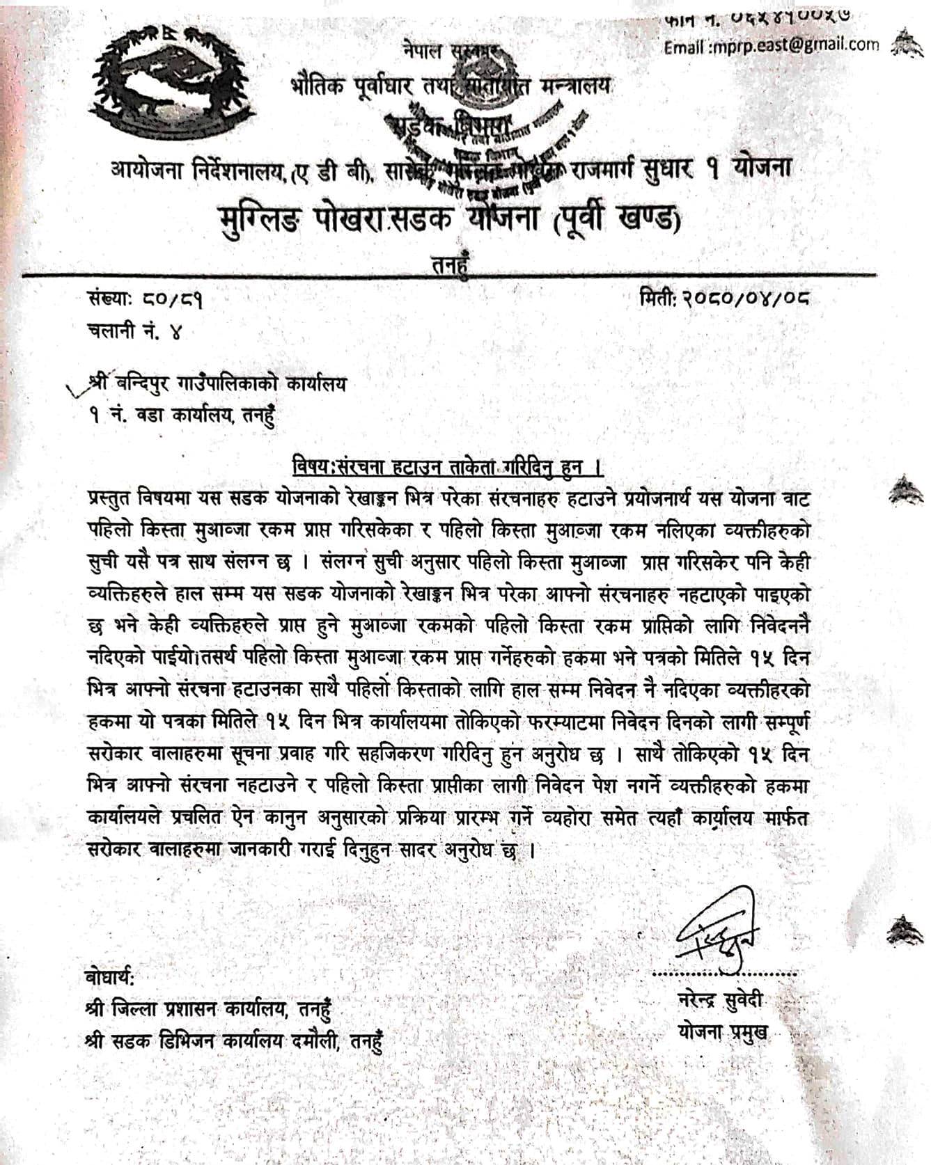 मुआब्जा लिईसकेका केही व्यक्तिले सडक योजनाको रेखाङ्कन भित्र परेका संरचना हटाउन आलटाल गरेपछि मुग्लिन पोखरा सडक योजना (पूर्वी खण्ड) उक्त घर टहरा हटाउन ताकेता गर्न बन्दिपुर गाउँपालिका वडा नम्बर १ को कार्यालयलाई अनुरोध गरेको छ । मुग्लिन पोखरा सडक योजना (पूर्वी खण्ड) का योजना प्रमुख नरेन्द्र सुवेदीले वडा नम्बर १ लाई पत्र लेख्दै सडक योजनाको रेखाङ्कन भित्र परेका संरचना हटाउन ताकेता गर्नु हुन अनुरोध गरेका छन् ।