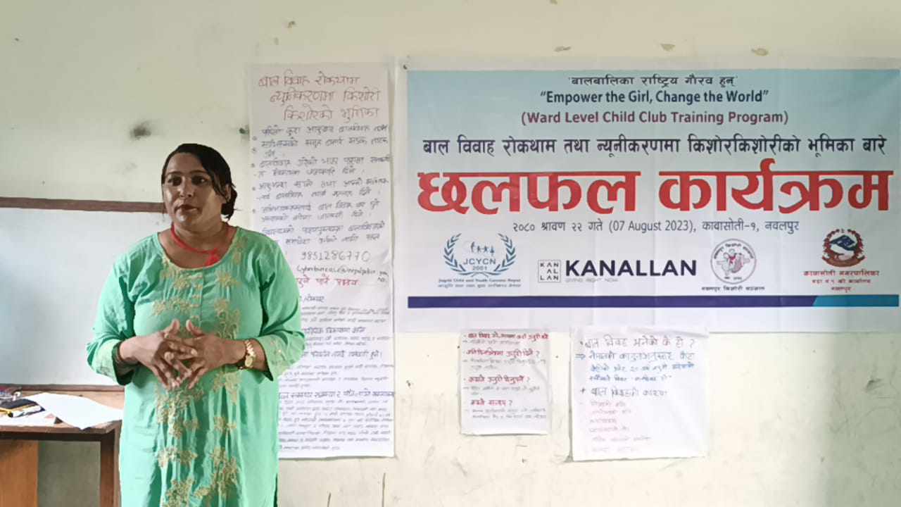 नवलपुरमा बाल बिवाहको दर बढदै गयकोले सानो उमेरमा नै आमा बन्ने तथ्यांकले देखाएको छ । सो कार्यक्रममा बाल बिवाह भनेको के हो ? बाल बिवाहको असरहरु के के हुन? नेपालमा कानुनी अवस्था के रहेको छ ? बालबालिकाले बाल बिवाह रोक्न गर्न सकिने कामहरुको बारेमा सहजीकरण गरिएको थियो ।