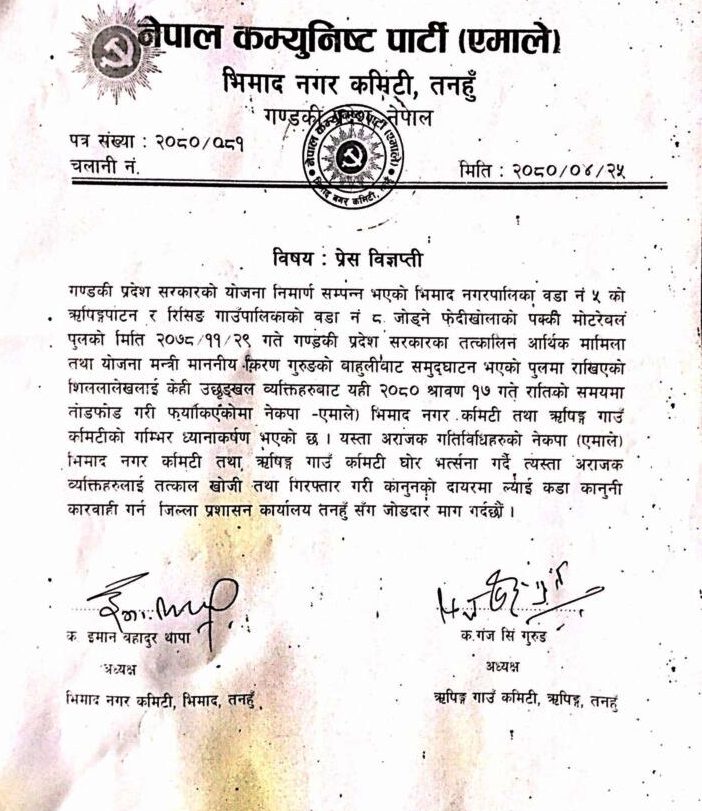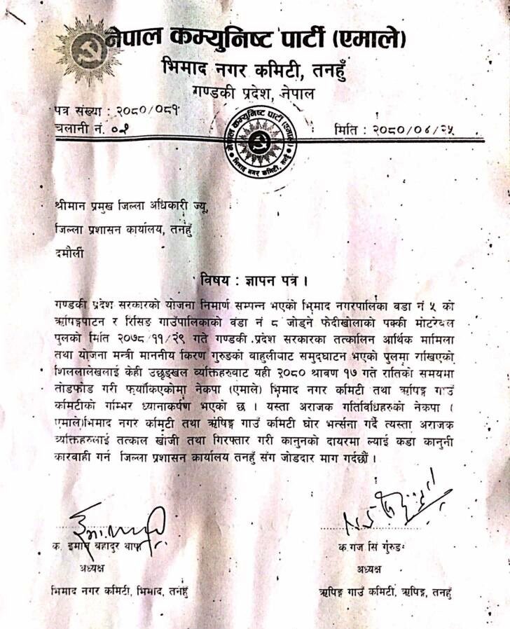 नेकपा एमाले भिमाद नगर कमिटि र ऋषिङ गाउँ कमिटिले भिमाद नगरपालिका–५ र ऋषिङ गाँउपालिका–८ जोड्ने फेदीखोलाको पक्की मोटरवेल पुलमा तोडफोड गर्नेहरुलाई कारवाही गर्न माग गरेको छ ।