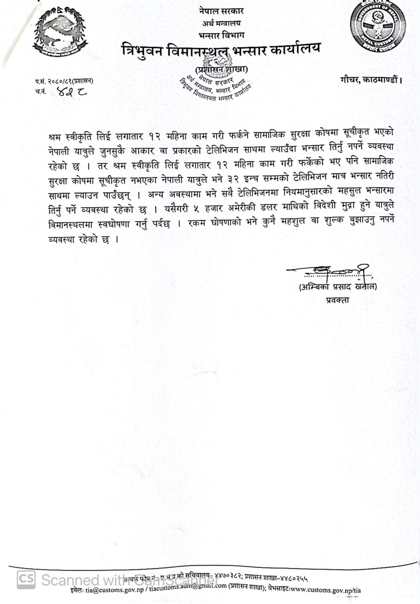 तर, श्रम स्वीकृति लिई लगातार १२ महिना काम गरी फर्केको भए पनि सामाजिक सुरक्षा कोषमा सूचीकृत नभएका नेपाली यात्रुले भने ३२ इन्चसम्मको टेलिभिजन मात्र भन्सार नतिरी साथमा ल्याउन पाउँछन् । अन्य अवस्थामा भने सबै टेलिभिजनमा नियमानुसारको भन्सारमा तिर्नु पर्ने व्यवस्था रहेको छ ।