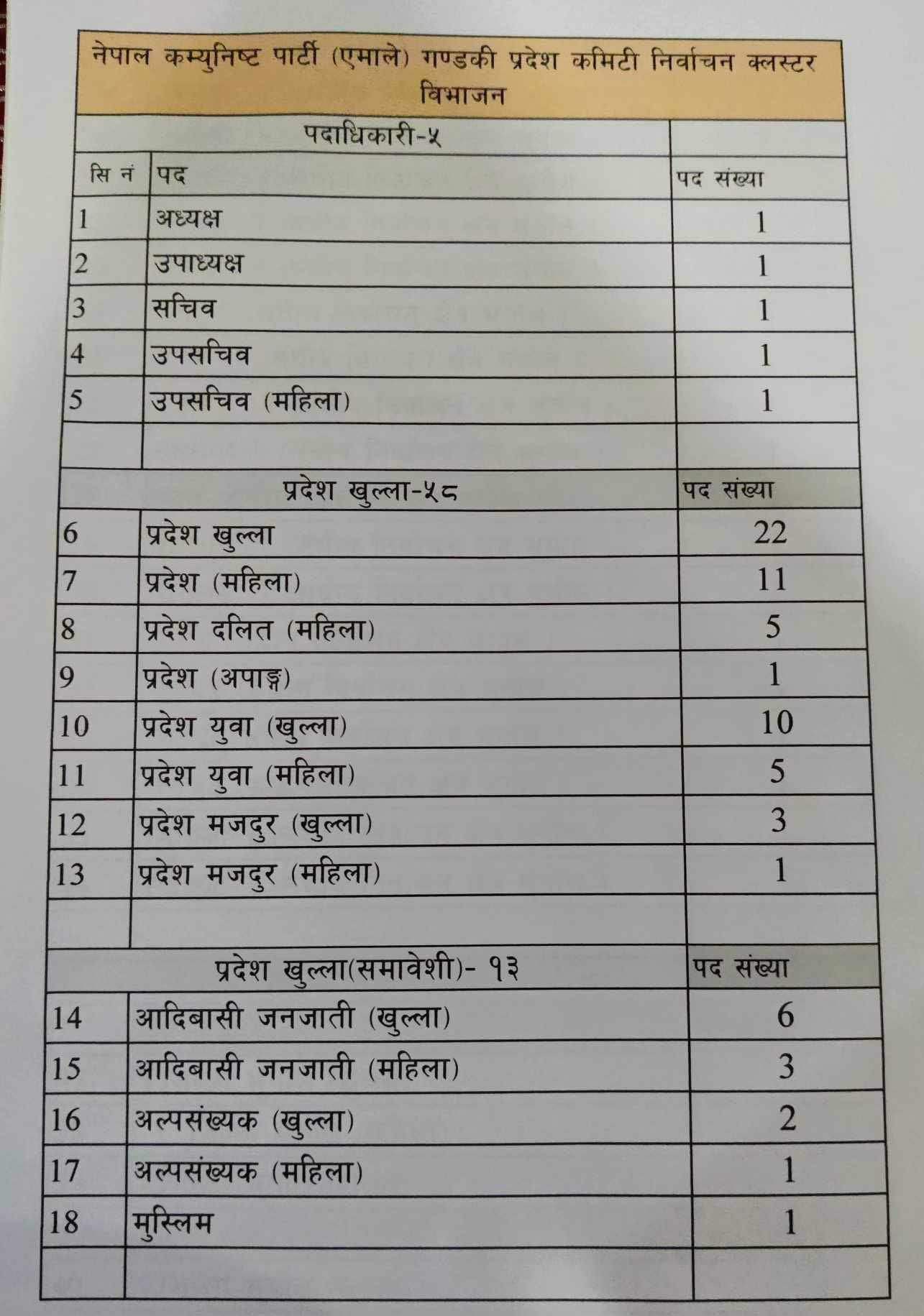 पोखरामा जारी नेकपा एमालेको गन्डकी प्रदेशको प्रथम अधिवेशनले अध्यक्ष, उपाध्यक्ष, सचिव, उपसचिव खुल्ला र उपसचिव महिला गरि पाँच पदाधिकारी निर्वाचित गर्ने छ ।