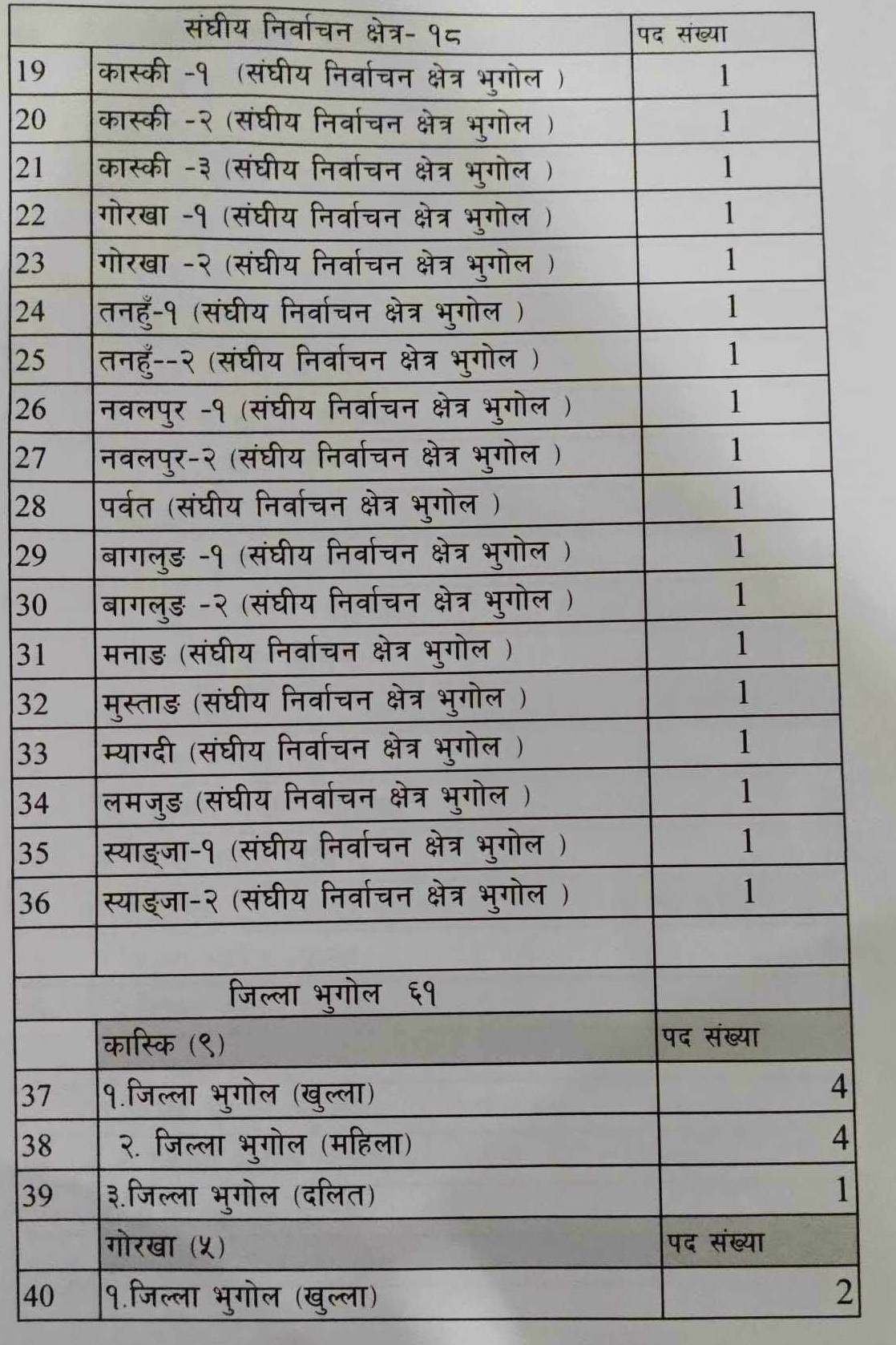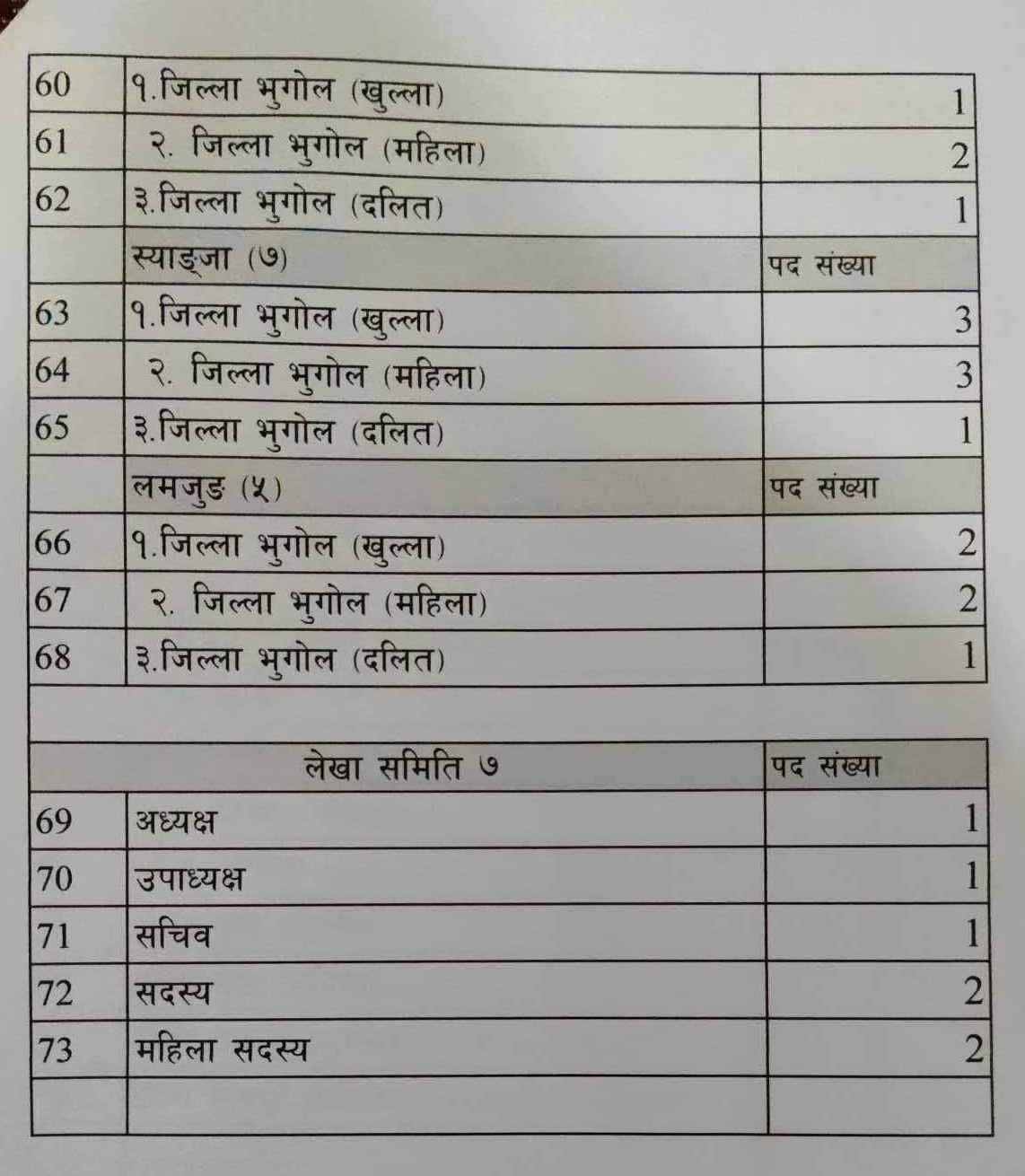 त्यस्तै समावेशी तर्फ आदिवासी जनजाती खुल्ला तर्फ ६ जना, जनजाती महिला ३ जना, अल्पसंख्यक खुल्ला २ जना, अल्पसंख्यक महिला १ जना र मुस्मिल १ जना निर्वाचित गर्नेछ । त्यसैगरि प्रदेश लेखा आयोगमा अध्यक्ष, उपाध्यक्ष र सचिव १÷१ जना तथा खुल्ला सदस्य २ र महिला सदस्य २ जना निर्वाचित गर्नेछ ।