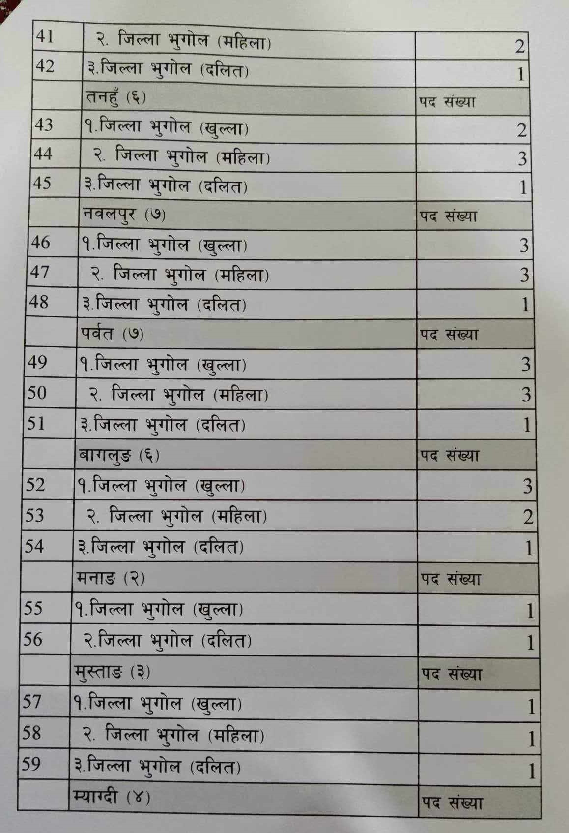 तनहुँले दुई वटा निर्वाचन क्षेत्रबाट एक÷एक जना, जिल्ला भुगोल अन्तर्गत खुल्लामा २ जना, जिल्लाभरबाट महिला ३ जना र दलित १ जना सदस्य पाएको छ । त्यस बाहेकका अन्य पदहरुमा निर्वाचित हुनु परेमा प्रदेशभर नै चुनाव लड्न पर्ने भएको छ ।