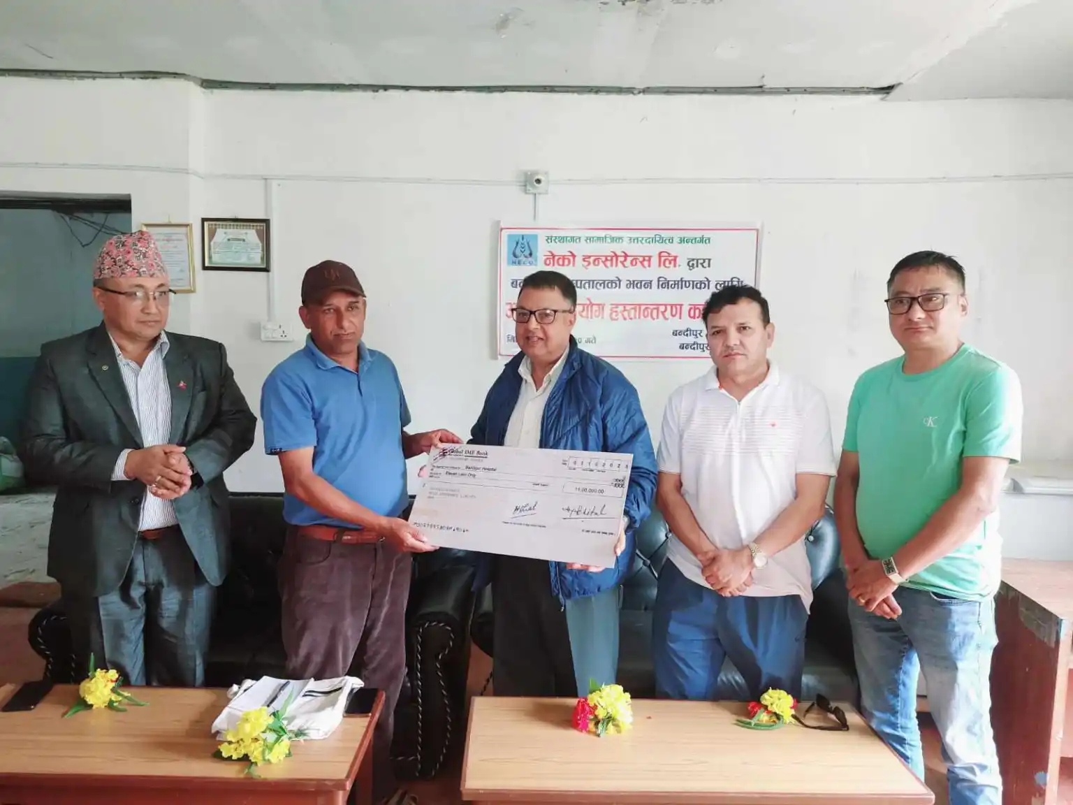 संस्थागत सामाजीक उत्तरदायित्व अन्तर्गत शनिबार बन्दीपुर अस्पतालमा आयोजना गरिएको एक कार्यक्रमका बिच इन्सोरेन्स कम्पनीका अध्यक्ष रोहीत कुमार भट्टराई, बोर्ड डाइरेक्टर प्रेम कुमार श्रेष्ठ, सहितको टिमले गाउँपालिका अध्यक्ष सुरेन्द्र बहादुर थापा र उपाध्यक्ष पञ्चमायाँ गुरुङलाइ चेक हस्तान्तरण गरेको गाउँपालिका अध्यक्ष सुरेन्द्र बहादुर थापाले बताए ।