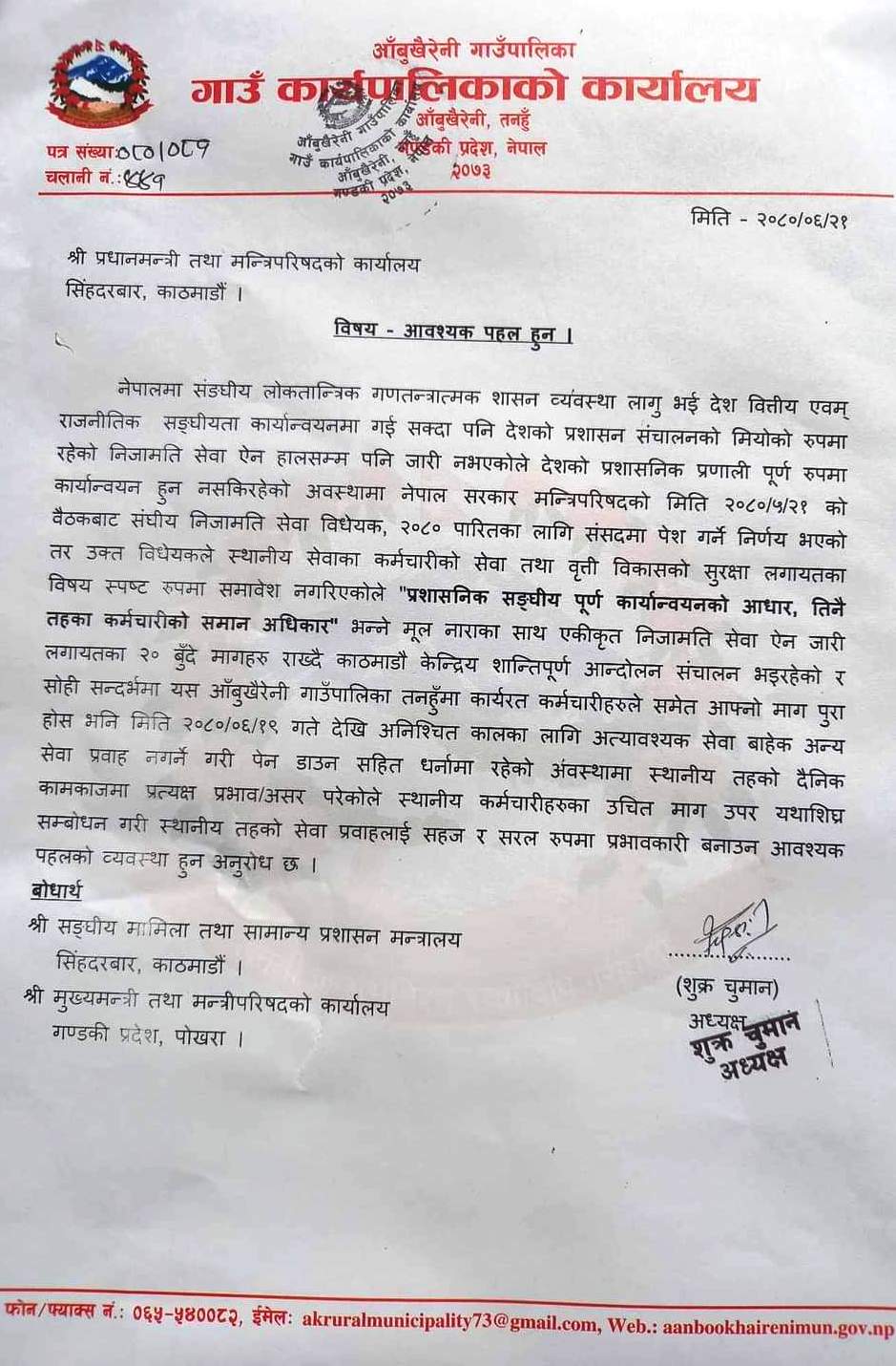 संघीय निजामती विधेयकमा आफ्ना मागहरु सम्बोधन गर्न माग गर्दै स्थानीय तहका कर्मचारीहरुले गरेको आन्दोलनको कारण स्थानीय तहको सेवा प्रभावित भएको छ । तनहुँका १० वटै स्थानीय तहमा कार्यरत कर्मचारीहरुले काम अबरुद्ध गरि धर्नामा बसेका छन् । सरकारले स्थानीय सेवाका कर्मचारीहरुको माको सुनुवाई नगरेको भन्द्र स्थानीय तहका कर्मचारीहरुले नियमित काम रोकेका हुन् ।
