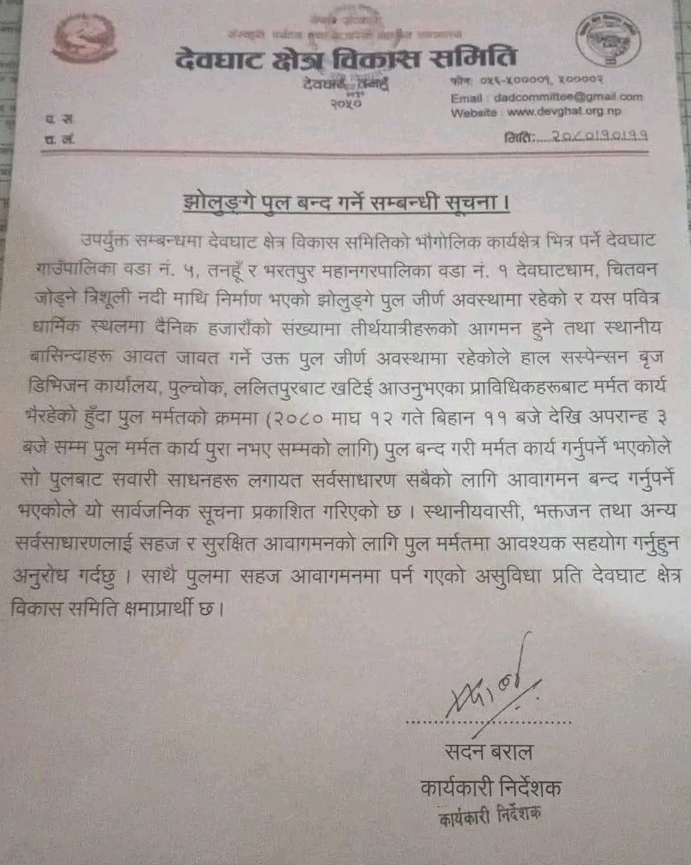 तनहुँको देवघाट गाउँपालिका र चितवनको भरतपुर महानगरपाकिो देवघाट जोड्ने त्रिशुली नदीको झोलुङ्गे पुल मर्मतको लागि शुक्रबार ४ घन्टा बन्द हुने भएको छ । पुल मर्मतकोलागि आज बिहान ११ बजेदेखी अपरान्ह ४ बजेसम्म पुल बन्द गरिने देवघाट क्षेत्र विकास समितिले जनाएको छ ।