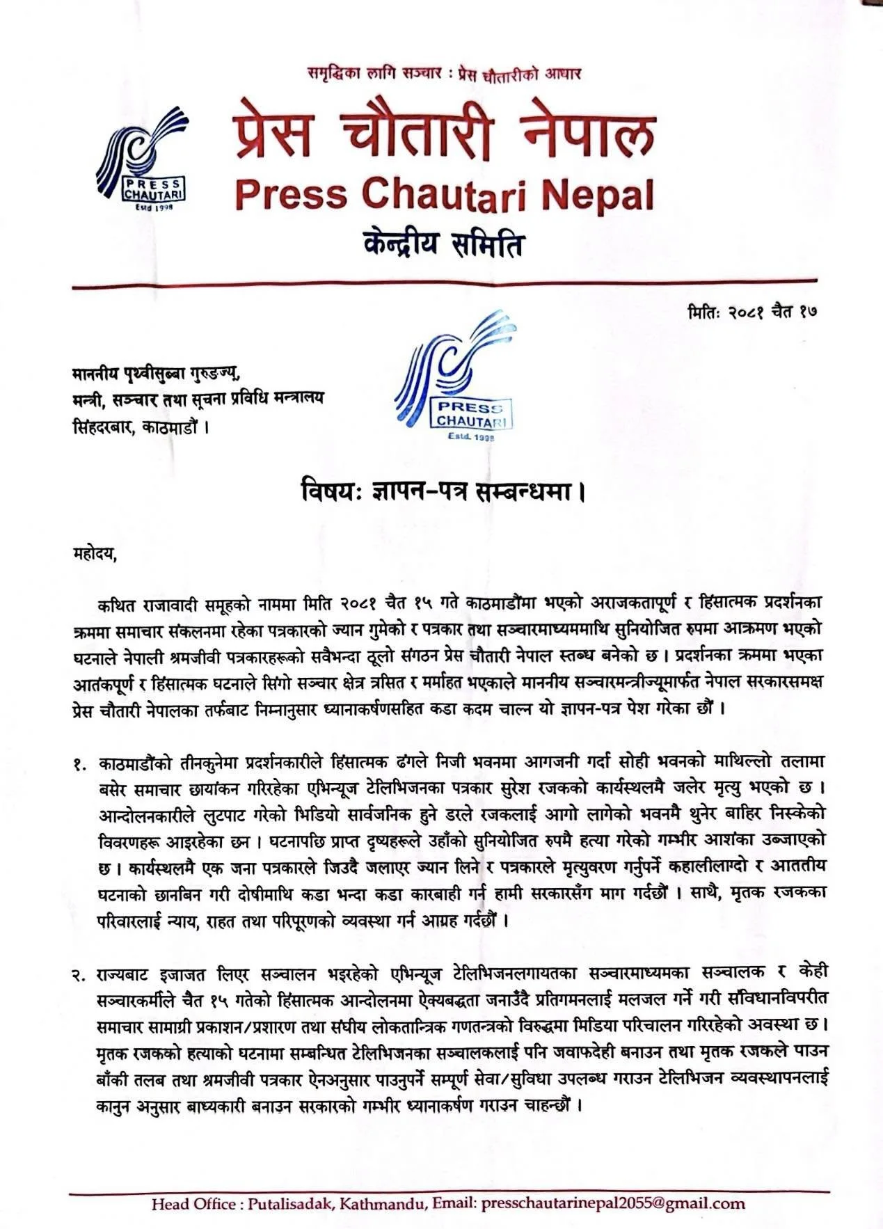 कथित राजावादी समूहको नाममा गत चैत १५ गते काठमाडौंमा भएको अराजकतापूर्ण र हिंसात्मक प्रदर्शनका क्रममा समाचार संकलनमा रहेका पत्रकारको हत्या भएको र पत्रकार तथा सञ्चारमाध्यममाथि सुनियोजित रुपमा आक्रमण भएको घटनाले प्रेस चौतारी नेपाल स्तब्ध बनेको भन्दै ज्ञापनपत्रमा प्रदर्शनका क्रममा भएका आतंकपूर्ण र हिंसात्मक घटनाले सिंगो सञ्चार क्षेत्र त्रसित र मर्माहत भएकाले सञ्चारमन्त्री मार्फत नेपाल सरकारसमक्ष प्रेस चौतारी नेपालका तर्फबाट ध्यानाकर्षणसहित कडा कदम चाल्न माग गरिएको छ ।