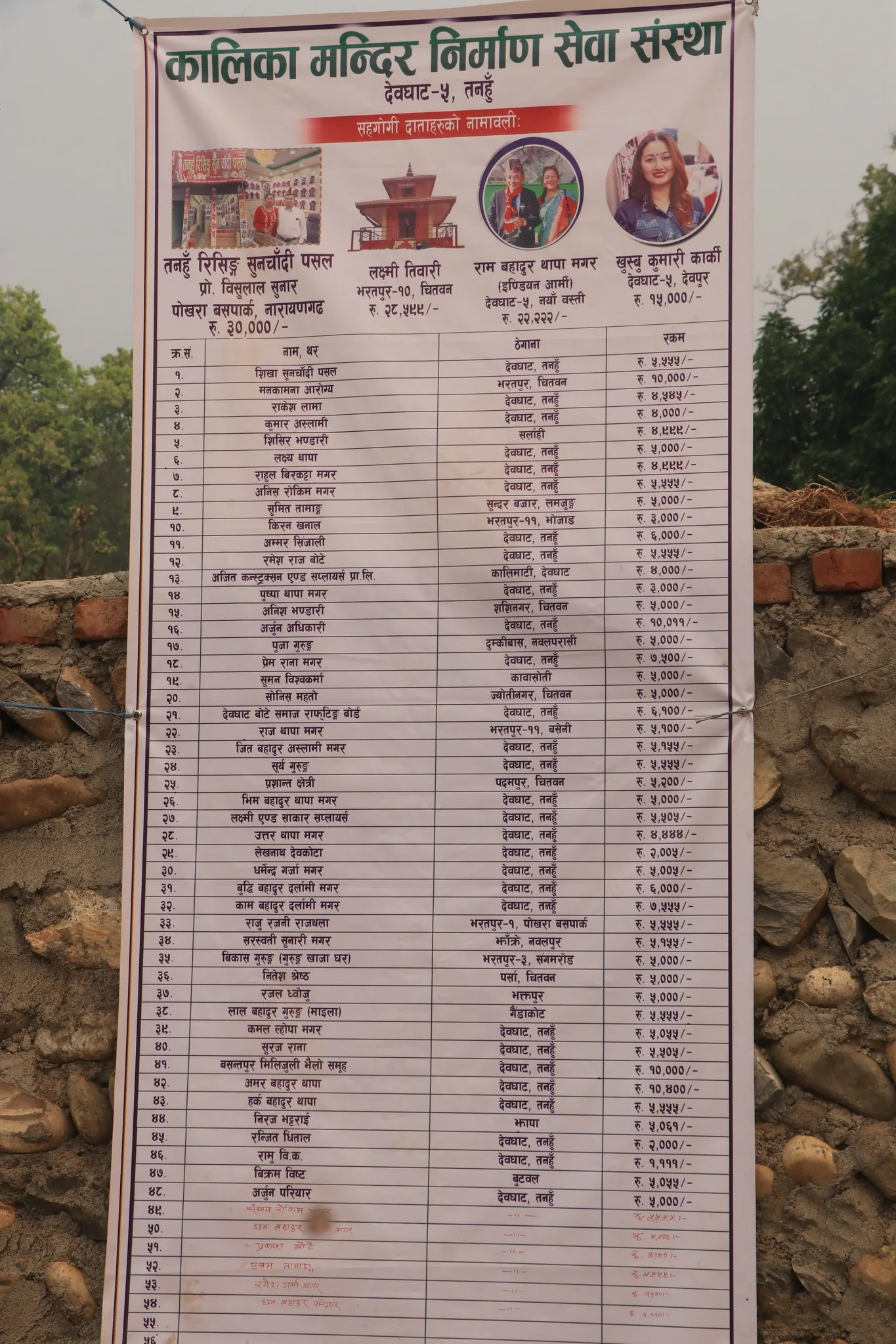 ५ हजार देखि ३० हजार रुपैयाँ सम्म सहयोग गर्ने दाताको एकजनाको नामावाली शिलापत्रमा लेखिने तथा ३० हजारदेखी ५० हजार सम्म सहयोग गर्नेको परिवारका दुई जनाको नाम शिलापत्रमा नाम लिखिने तथा ५० हजार भन्दा माथि सहयोग गर्नेको ३ पुस्ते विवरण शिलापत्रमा लेखिने आर्थिक संयोजक थापाले बताए ।