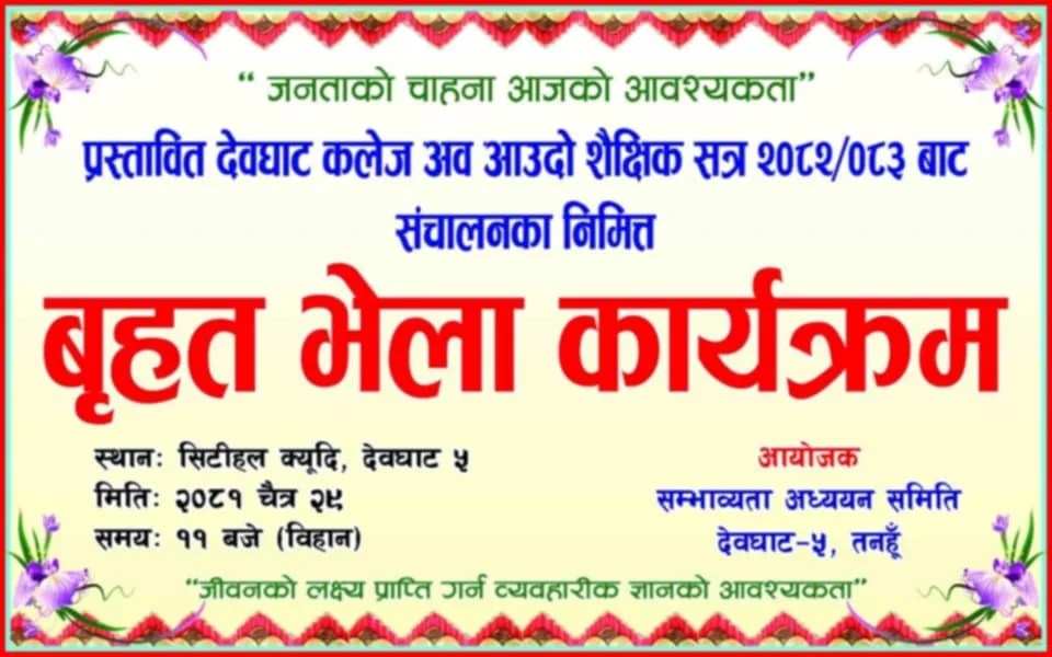 क्याम्पस सन्चालन गर्ने विषयमा सहमती भएपनि के कसरी आर्थिक र आवश्यक पूर्वाधारको व्यवस्थापन गरि प्रस्तावित देवघाट कलेज, सन्चालन गर्ने भन्ने विषयमा सुझाव संकलनको लागि सम्भाव्यता अध्ययन समितिले चैत २९ गते देवघाट गाउँपालिकाको सिटिहल क्युँदीमा बृहत भेलाको आयोजना गरेको छ ।