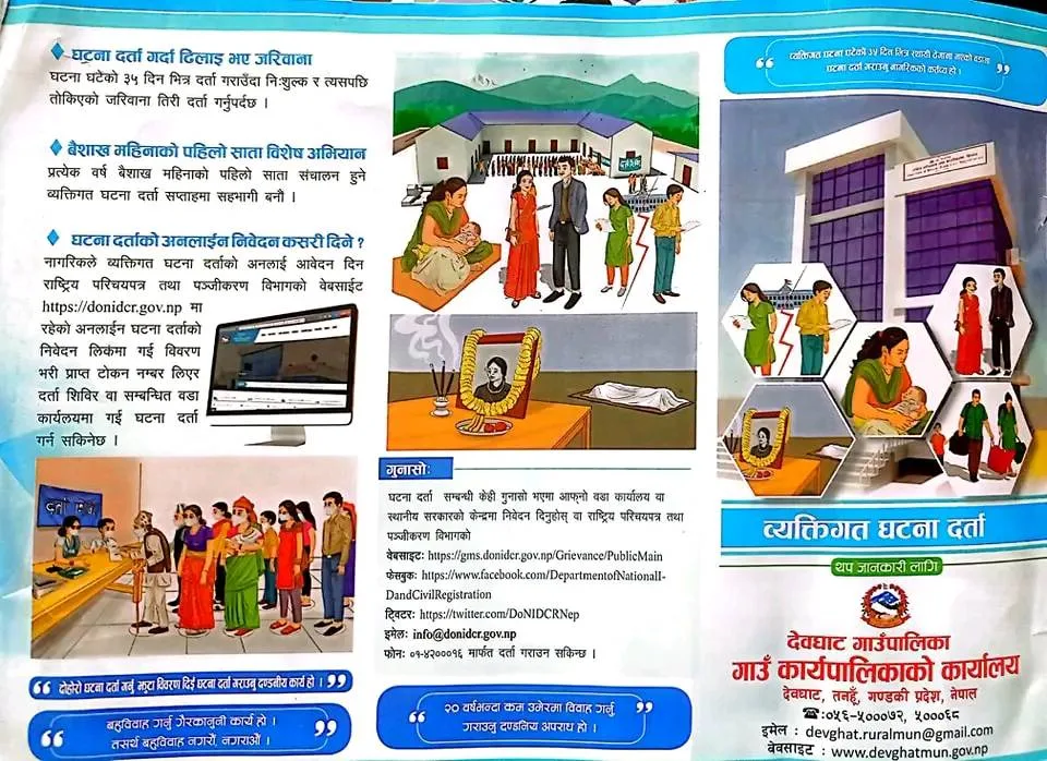 देशै भरका स्थानीय तहमा बैशाख १ गतेदेखी देशैभर व्यक्तिगत घटना दर्ता सप्ताह सुरु भएको छ । उक्त व्यक्तिगत घटना दर्ता सप्ताह बैशाख ७ गतेसम्म चल्ने छ ।