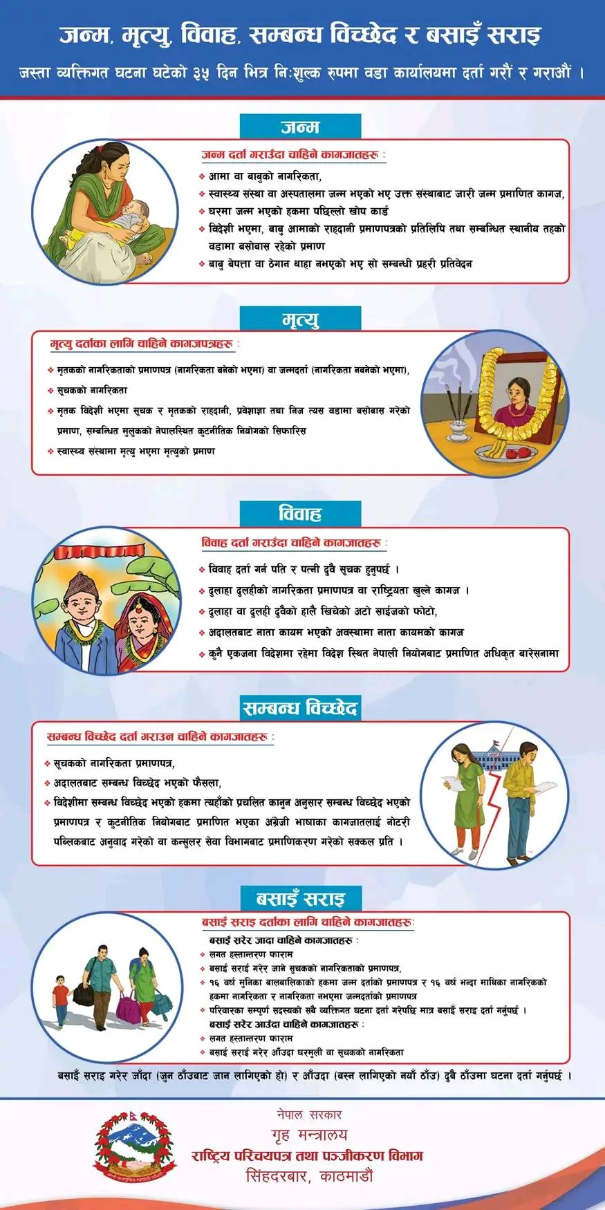 जन्म, मृत्यु, विवाह, सम्बन्ध विच्छेद र बसाईंसराई जस्ता व्यक्तिगत घटनाहरु घटना घटेको पैंतीस दिन भित्र आफ्नो स्थायी ठेगाना वा घटना घटेको स्थानको वडा कार्यालयमा गई अनिवार्य रुपमा दर्ता गर्न र गराउन सरकारले व्यक्तिगत घटना दर्ता सप्ताह मनाएको हो ।
