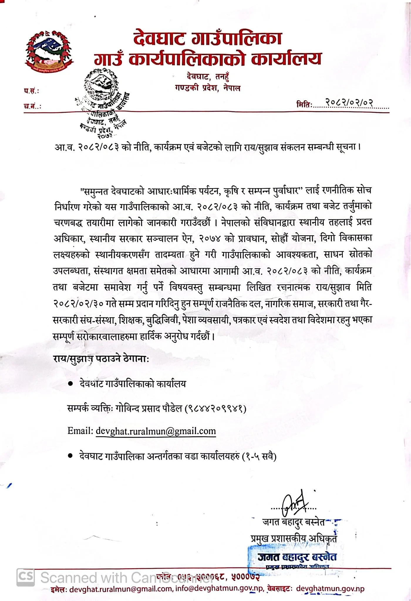 देवघाट गाउँपालिकाले आगामी आर्थिक वर्ष २०८२÷०८३ को नीति, कार्यक्रम एवं बजेटको लागि राय सुझाव पठाउन नागरिकहरुमा अनुरोध गरेको छ ।