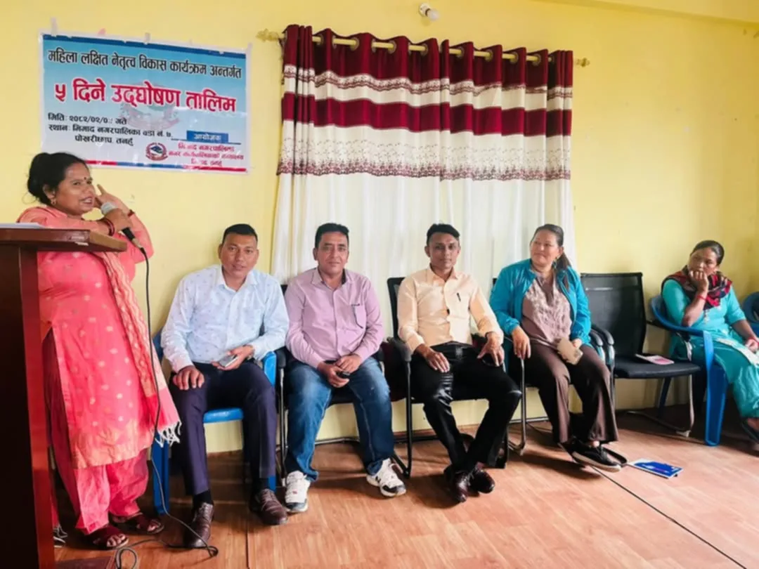 वडा नम्बर ७ पोखरीछाप स्थित वडा कार्यालयको सभाहलमा सञ्चालन भएको सो तालिमको उद्घाटन गर्दै अध्यक्ष श्रेष्ठले महिलाहरुको व्यक्तित्व विकासमा जोड दिँदै तालिम सञ्चालन गरिएको बताए । साथै यस तालिम बाट आफ्नो स्तर परिवर्तन गरी व्यक्तित्व विकास गर्न सक्नुपर्ने तथा महिलाहरुले कुनै पनि कुरा सम्बन्धित निकायमा निर्धक्क भएर राख्न सक्ने देखि राजनीतिक पहुँच बढाउनुपर्ने अध्यक्ष श्रेष्ठले बताए ।