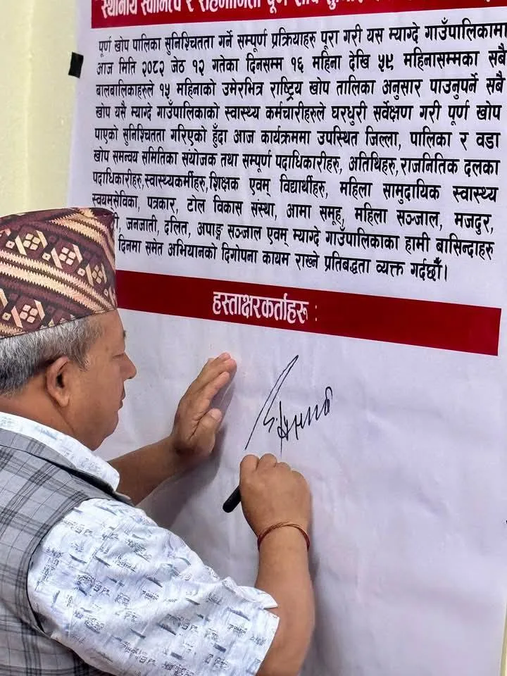 उक्त कार्यक्रममा उपस्थित वडा खोप समन्वय समितिका संयोजक तथा सम्पूर्ण पदाधिकारीहरु, अतिथिहरु, स्वास्थ्यकर्मीहरु, शिक्षक, महिला सामुदायिक स्वास्थ्य स्वयम्सेविका, पत्रकार, टोल विकास संस्था, आमा समूह, महिला सञ्चाल, मजदुर, व्यापारी, जनजाती, दलित, अपाङ्ग सञ्जाल एवं म्याग्दे गाउँपालिकाका हामी बासिन्दाहरुले आगामी दिनमा समेत उक्त खोप अभियानको दिगोपना कायम राख्ने प्रतिबद्धता व्यक्त गरिएको प्रतिबद्धता पत्रमा हस्ताक्षर गरेका थिए ।