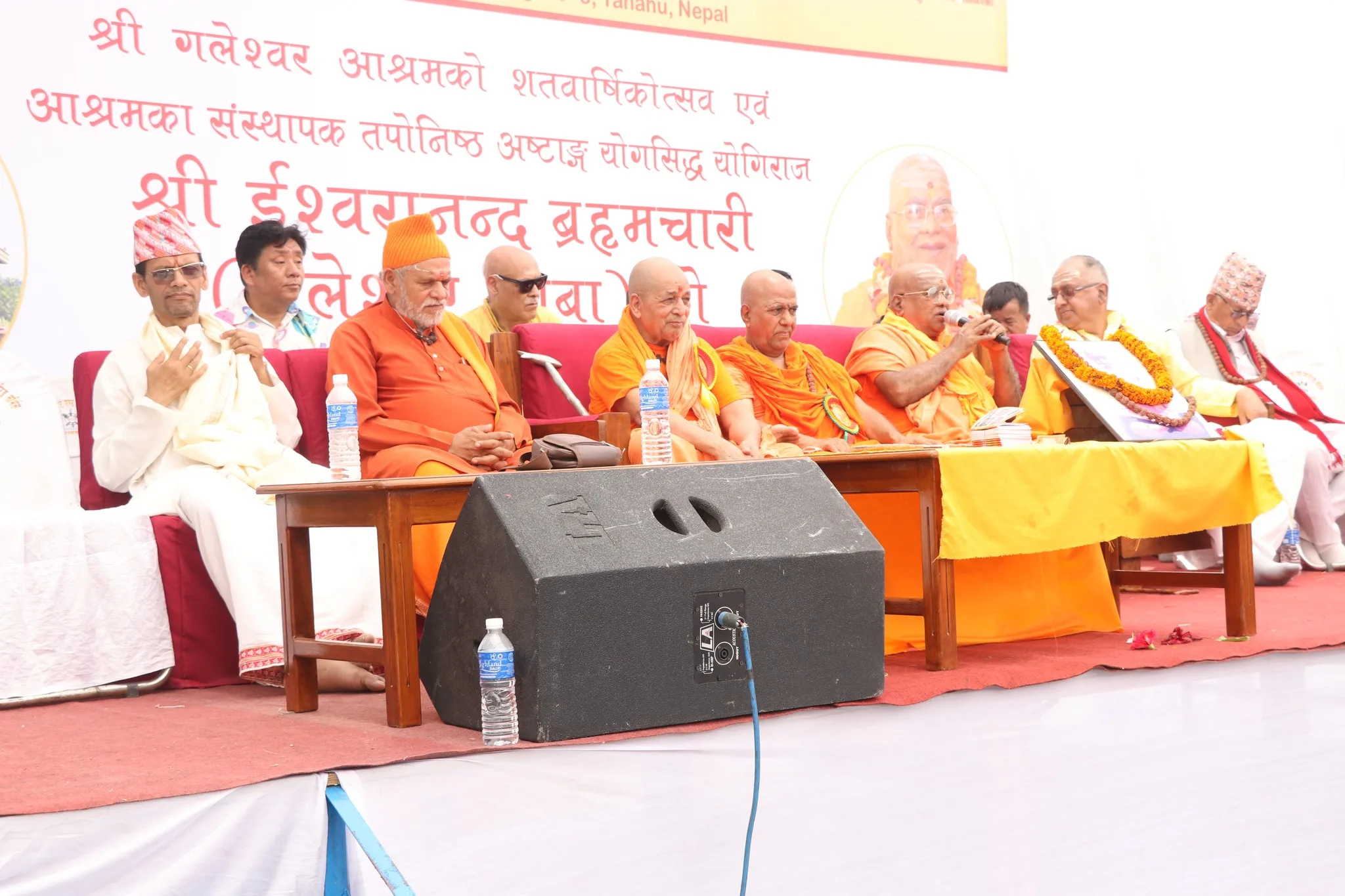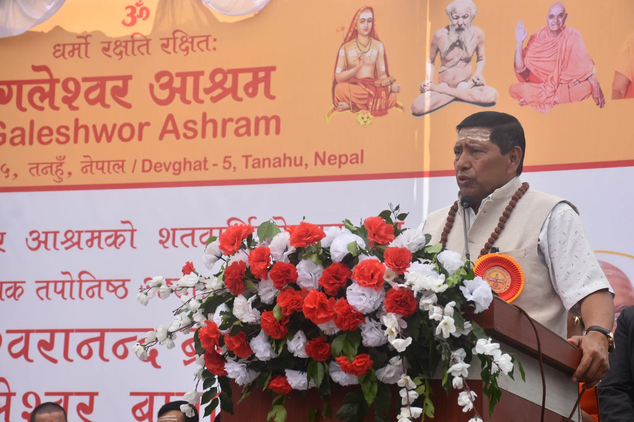 आश्रमका पिठाधिश अनन्त श्री विभुषित महामन्डलेश्वर स्वामी आत्मानन्द गिरीजी महाराजको अध्यक्षतामा भएको उक्त कार्यक्रममा बोल्दै पुर्व उपप्रधानमन्त्री नारयणकाजी श्रेष्ठले गलेश्वर बाबाले मानव जातीको कल्याणकोलागि आश्रमहरु स्थापना गरेर राम्रो काम गर्नु भएको बताए । देवघाट पवित्र तपो भुमी भएको भन्दै श्रेष्ठले यो भुमीले मानव जातीलाई मानव कल्याणमा लाग्न प्रेरणा दिने बताए । ‘आज मानव जातीलाई यो भुमीले ज्ञान प्रदान गरेको छ । आध्यात्मिकता प्रदान गरेको छ’ श्रेष्ठले भने ‘आजको मुख्य कार्यभार जनताको आर्थिक विकास र समृद्धी हो । त्यसकोलागि सुशासन आवश्यक पर्छ, आध्यात्मिकताले नागरिकलाई अनुशासन र सुशासनमा मा बाँध्न सहयोग गर्छ ।’