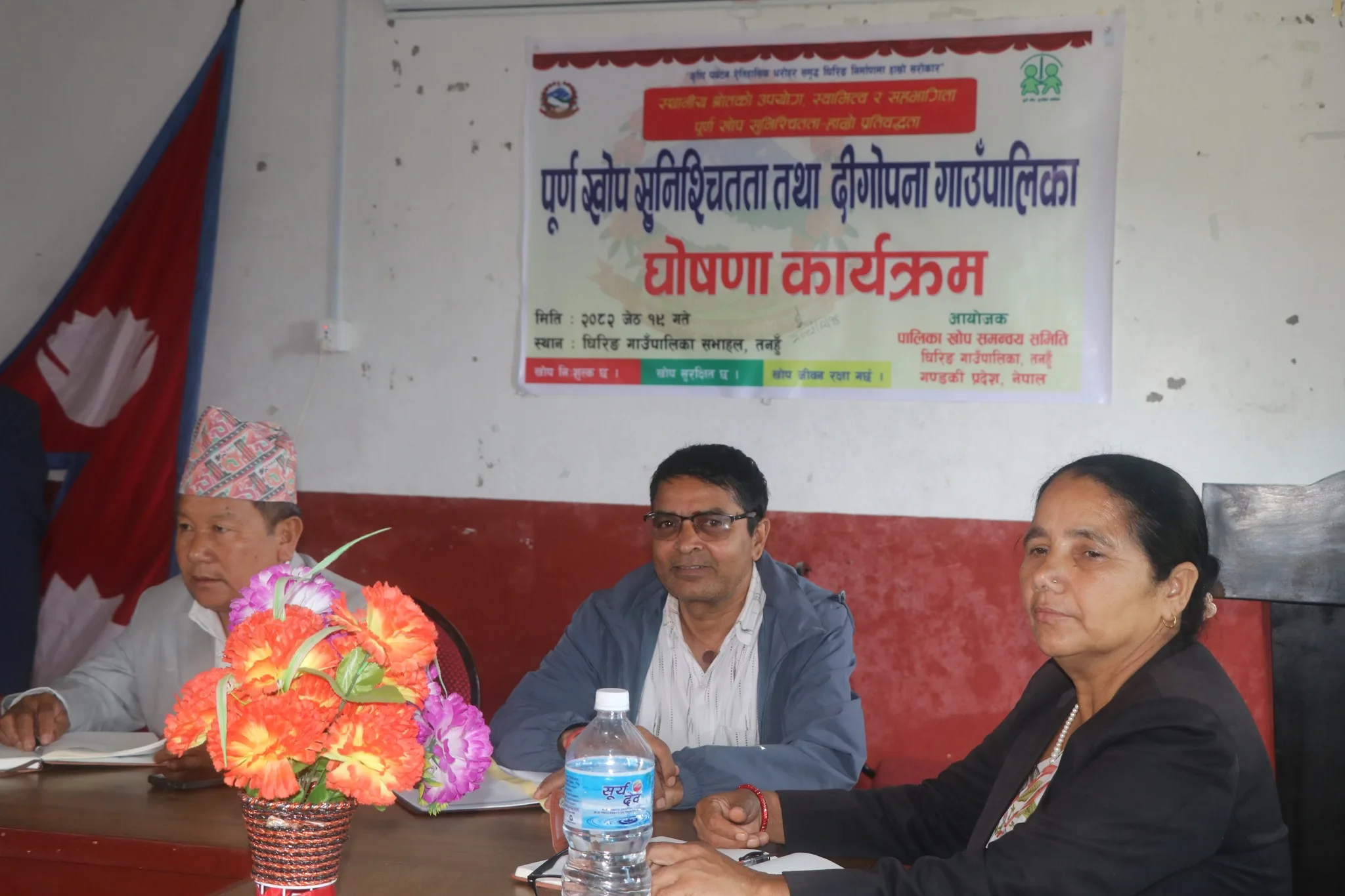 गाउँपालिकाका अध्यक्ष थापाको अध्यक्षतामा आयोजित सो कार्यक्रममा गाउँपालिकाका उपाध्यक्ष राधादेवी अधिकारी, प्रमुख प्रशासकीय अधिकृत कृष्णप्रसाद ढकाल, स्वास्थ्य कार्यालय तनहुँका प्रमुख अमर दवाडी, गाउँपालिकाका निवर्तमान अध्यक्ष रनबहादुर राना, सबै वडाका अध्यक्षहरु, नेकपा एमाले घिरिङ गाउँ कमिटीका अध्यक्ष सुमन कुमार श्रेष्ठ, चन्द्रज्योती माविका प्रअ प्रेमबहादुर थापा, स्वास्थ्यकर्मी प्रविण श्रेष्ठ, महिला स्वास्थ्य स्वंय सेविका चन्द्रकला थापा लगायतले मन्तव्य राखेका थिए ।