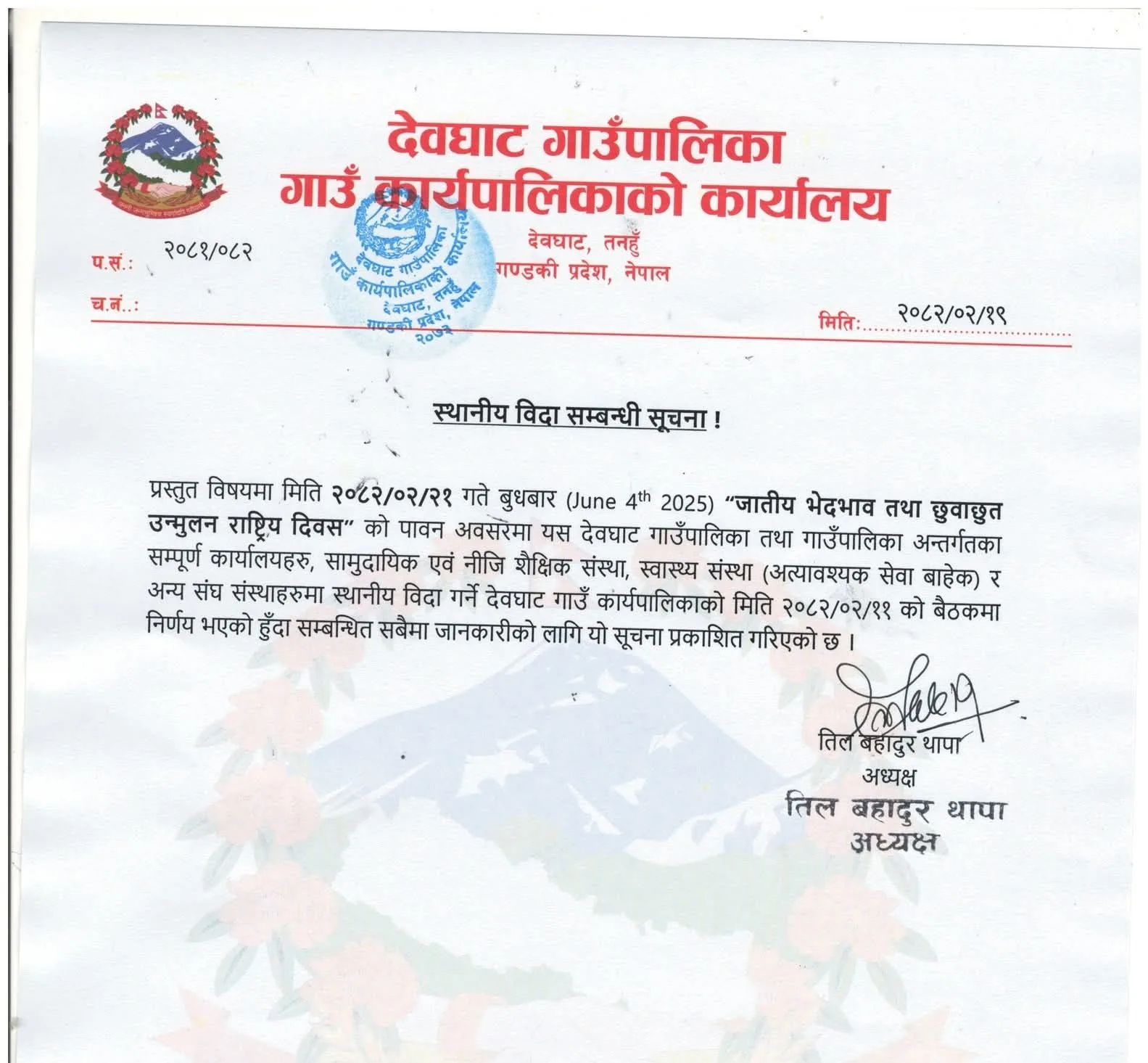 उक्त दिवसको अवसरमा तनहुँका सबै स्थानीय तहले स्थानीय बिदा दिएका छन् । सबै स्थानीय तहले स्थानीय तह अन्तर्गतका कार्यालय, सम्पुर्ण वडा कार्यालय, विद्यालय तथा संघ संस्थामा सार्वजानिक बिदा दिएका छन् । स्थानीय तहले जातिय विभेद तथा छुवाछुत उन्मुलन सम्बन्धी सचेतना कार्यक्रम सन्चालन गर्न पनि अनुरोध गरेका छन् ।