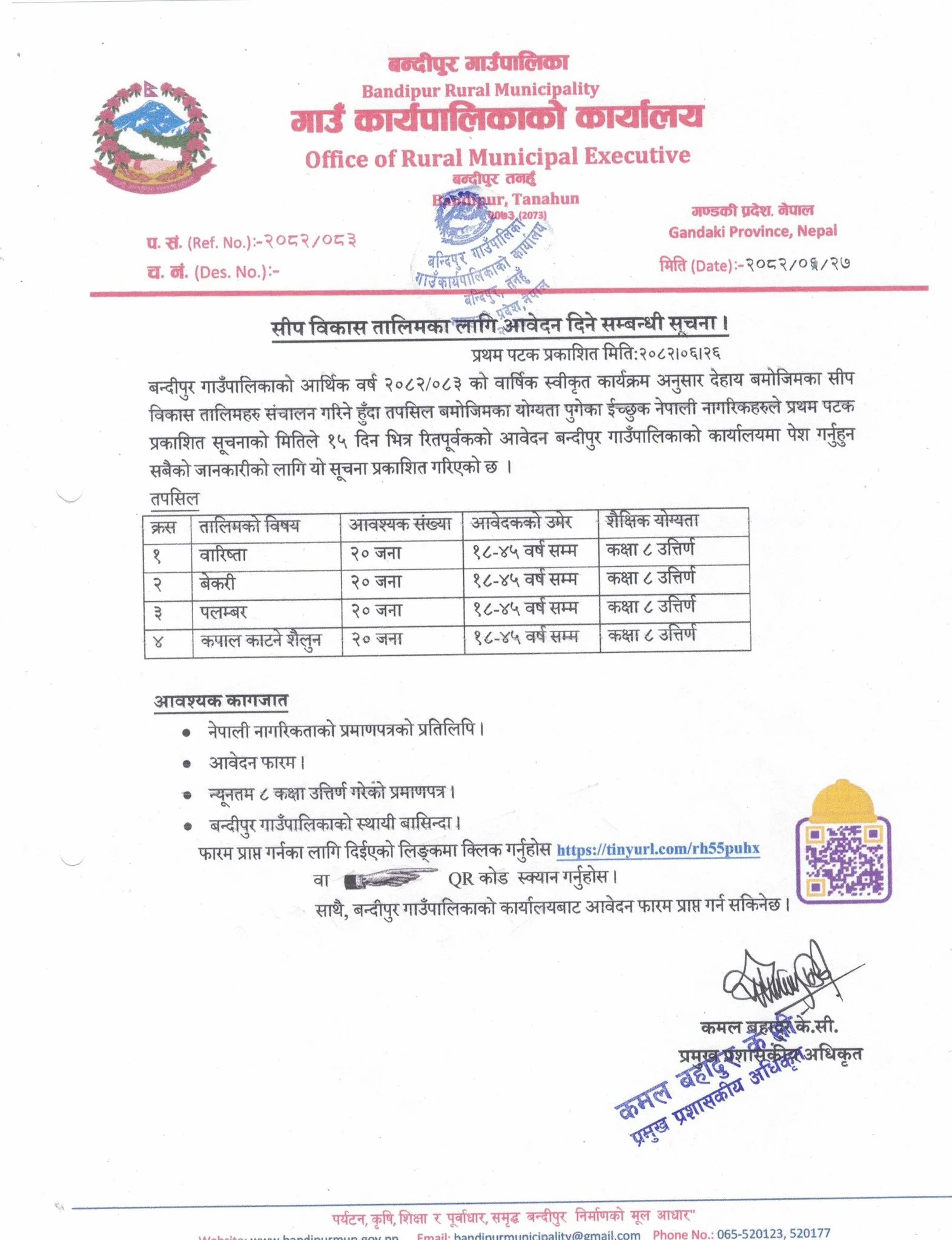 बन्दीपुर गाउँपालिकाले युवाहरुलाई विभिन्न सिप मुलक तालिम दिने भएको छ । बन्दीपुर गाउँपालिकाको आर्थिक वर्ष २०८२/०८३ को वार्षिक स्वीकृत कार्यक्रम अनुसार कम्तिमा कक्षा ८ उत्तिर्ण गरेका कम्तीमा ८० जना युवाहरुलाई विभिन्न सिप विकास सम्बन्धी तालिम दिने भएको हो ।