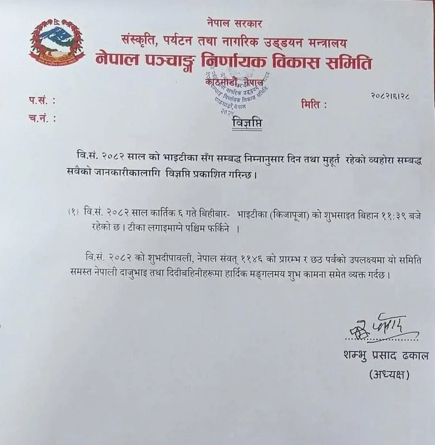 नेपाल पञ्चाङ्ग निर्णायक विकास समितिले यस वर्षको भाइटीकाको उत्तम साइत सार्वजनिक गरेको छ । कात्तिक ६ गते बिहीबार बिहान ११ः३९ बजे भाइटीकाको साइत उत्तम रहेको समितिका अध्यक्ष प्रा. शम्भुप्रसाद ढकालले जानकारी दिए ।