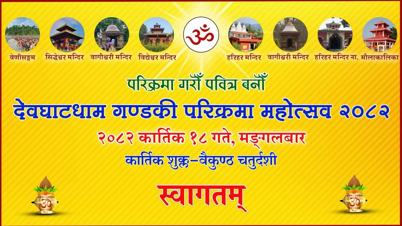 मध्य नेपालको तनहुँ, चितवन र नवलपुर जिल्लामा फैलिएको पवित्र तिर्थस्थल देवघाटधाम र गन्डकीको संगमको पुर्ण पावन उर्जा प्राप्त गर्ने तथा संसारकै दुर्लभ तिर्थ देवघाटधामको धार्मिक महत्व तथा भौतिक विकासलाई सम्बद्र्धन गर्दै बैदिक सनातन धर्म र संस्कृतिको प्रचार प्रसार गर्ने उद्देश्यले यस क्षेत्रमा साधनारत रहेका सन्त माहात्माहरुको अगुवाईमा कार्तिक शुक्ल बैकुण्ठ चतुर्दशीको दिन देवघाटधाम गन्डकी परिक्रमा महोत्सव हुने महेश संस्कृत गुरुकुल देवघाटका प्रधानाचार्य फणिन्द्रप्रसाद पौडेलले जानकारी दिए । नेपाल सन्त समाजको आयोजना तथा देवघाट गाउँपालिका र देवघाट क्षेत्र विकास समितिको सहयोगमा देवघाटधाम गन्डकी परिक्रममा महोत्सव हुनेछ ।