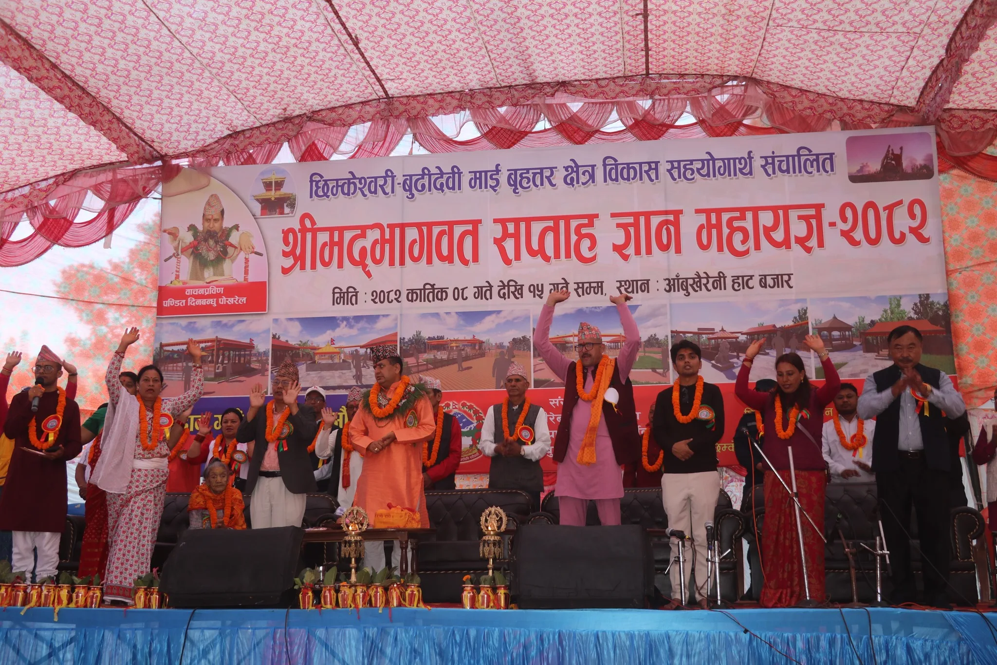 महायज्ञमा वाचन प्रविण पण्डित श्री दिनबन्धु पोखरेलको मुखारविन्दबाट श्रीमद्भागवत वाचन तथा ज्ञानगङ्गा प्रवाह भइरहेको छ।