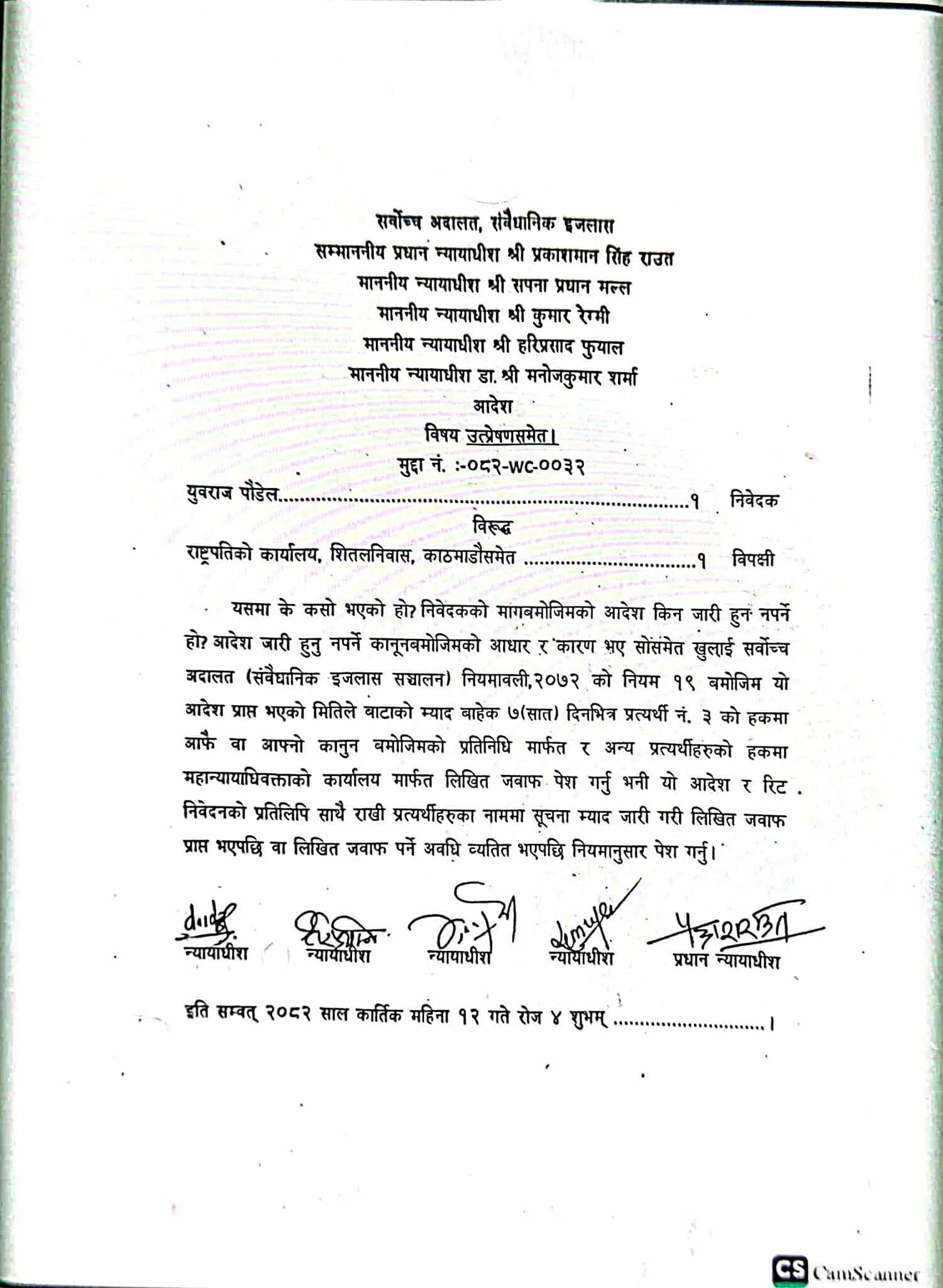 इजलासले विपक्षी राष्ट्रपति कार्यालय, प्रधानमन्त्री तथा मन्त्रिपरिषद्को कार्यालयलगायतलाई ७ दिनभित्र लिखित जवाफ पेस गर्न आदेश दिएको छ ।