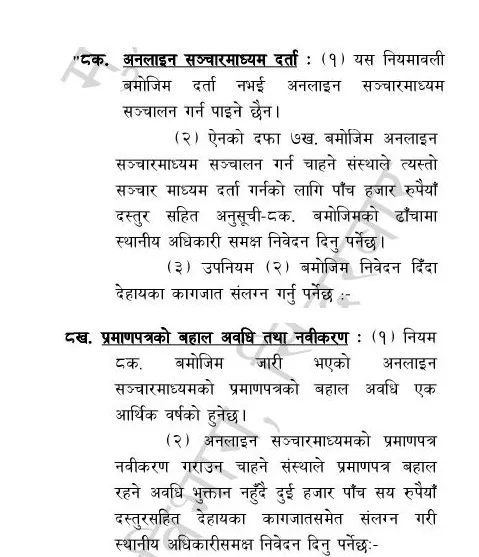 नियमावलीअनुसार, कुनै पनि संस्थाले अनलाइन सञ्चारमाध्यम सञ्चालन गर्नका लागि सूचना तथा प्रसारण विभाग अन्तर्गतका स्थानीय अधिकारीसमक्ष ५ हजार रुपैयाँ दस्तुरसहित निवेदन दिनुपर्नेछ । यस्तै दर्ता भइसकेपछि अनलाइन सञ्चारमाध्यमको प्रमाणपत्रको बहाल अवधि एक आर्थिक वर्षको हुने व्यवस्था कायमै राखिएको छ ।