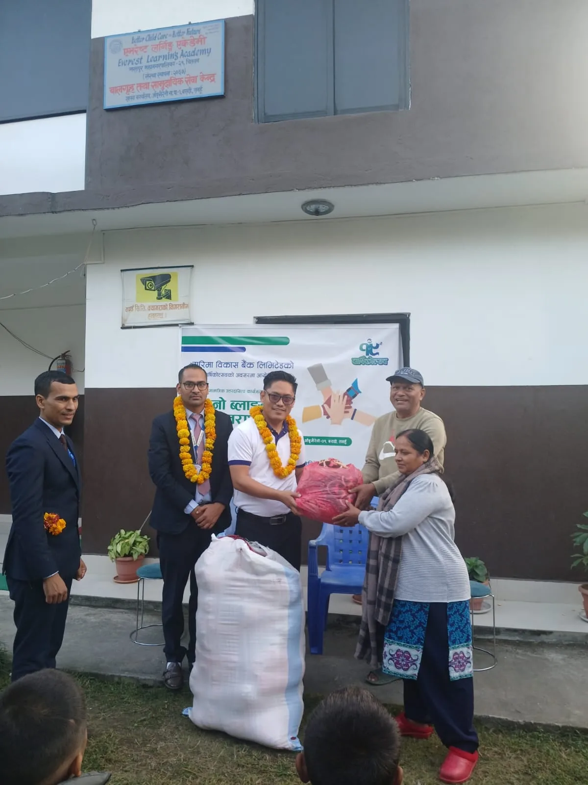 बैंकको डुम्रे, शाखाले आबुखैरेनी गाउँपालिका–१ बरादी स्थित एभरेस्ट लर्निङ एकेडेमी बालगृहमा रहेका १३ जना अनाथ बालबालिकालाई न्यानो ब्ल्याङ्केट वितरण गरेको छ। कार्यक्रममा गरिमा विकास बैंक नारायणगढ क्षेत्रीय प्रमुख कुमार गुरुङ र डुम्रे शाखा प्रबन्धक बुद्धि सागर ढकालले बैंकका गतिविधि तथा सामाजिक उत्तरदायित्वबारे आफ्ना धारणा व्यक्त गरेका थिए। सो क्रममा बालगृह व्यवस्थापक जमुना देवी पोखरेलले स्वागत मन्तव्य दिँदै संस्थाका सचिव बाबुराम भट्टले बैंकको टोलीप्रति आभार तथा कृतज्ञता प्रकट गरेका थिए।