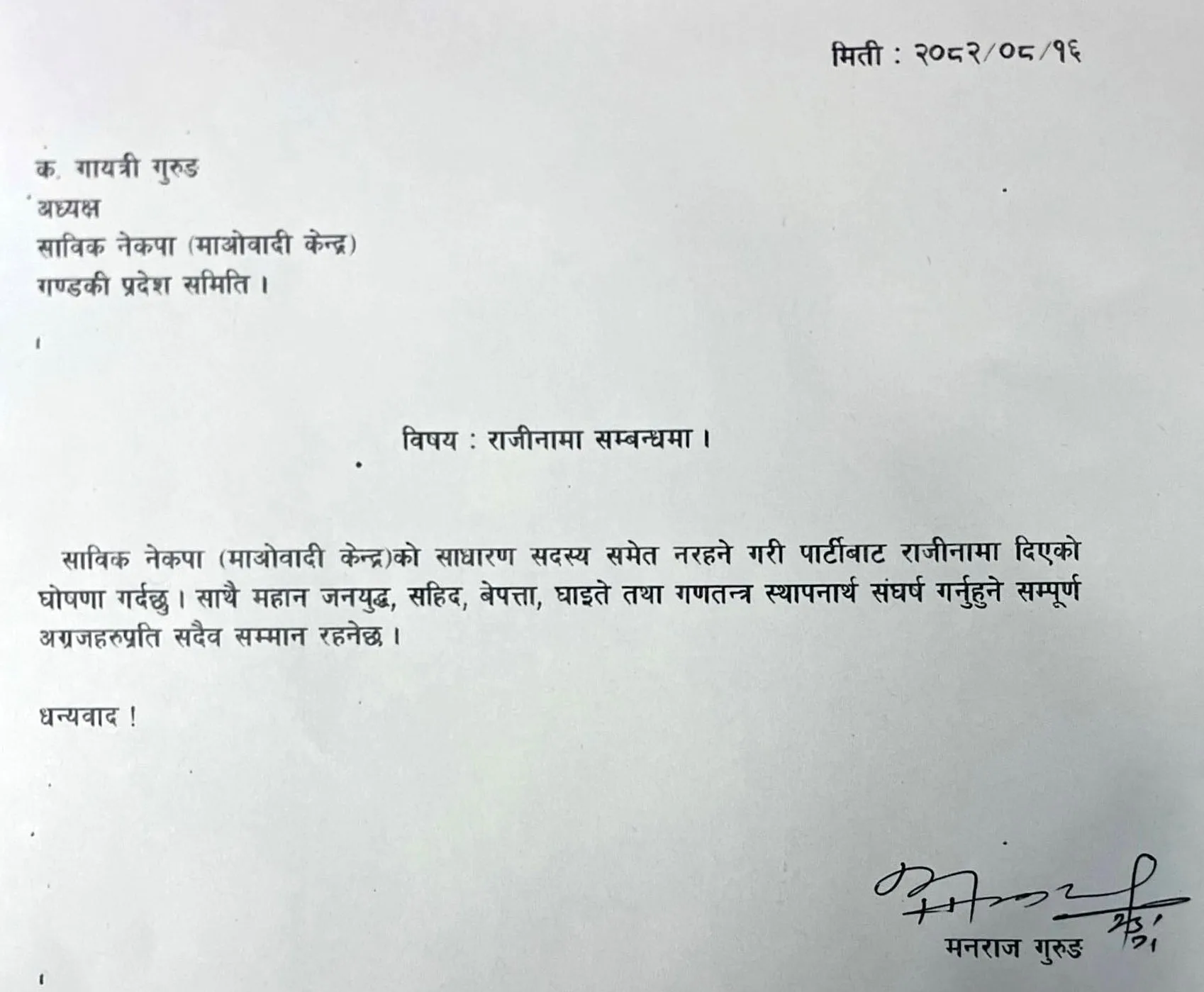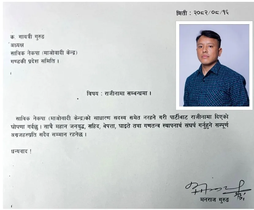 शुक्लागन्डकी नपा–१२ घर भएका युवा नेता गुरुङले मंगलबार नेकपा माओवादी केन्द्र गन्डकी प्रदेश कमिटिकी अध्यक्ष गायत्री गुरुङलाई सम्बोधन गरि उक्त पार्टीको साधारण सदस्य समेत नरहने गरि राजिनामा दिएको जानकारी गराएका छन् ।
