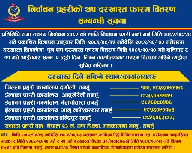 जिल्ला प्रहरी कार्यालय बाहेक सशस्त्र प्रहरी गण भानु, इलाका प्रहरी कार्यालय आबुँखैरेनी, बन्दीपुर, भानु नारेश्वरटार र खैरेनी बेलचौतारामा समेत आवेदन दिन पाईने सुचनामा जनाईएको छ । त्यसैगरि यस अघि आवेदन दिएका मध्ये लिखित शुक्रबार भएको लिखित परिक्षामा सहभागी हुन नसकेकाहरुले पनि १२ गते विहान हुने परिक्षामा सहभागी हुन सक्ने जिल्ला प्रहरी कार्यालयले जनाएको छ ।