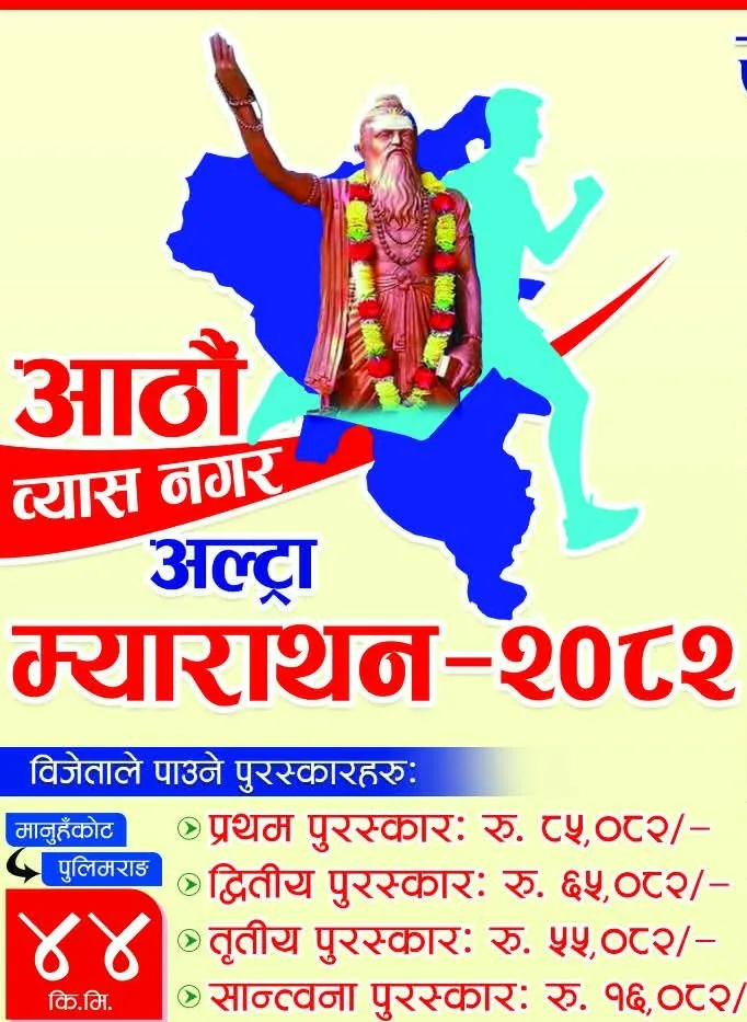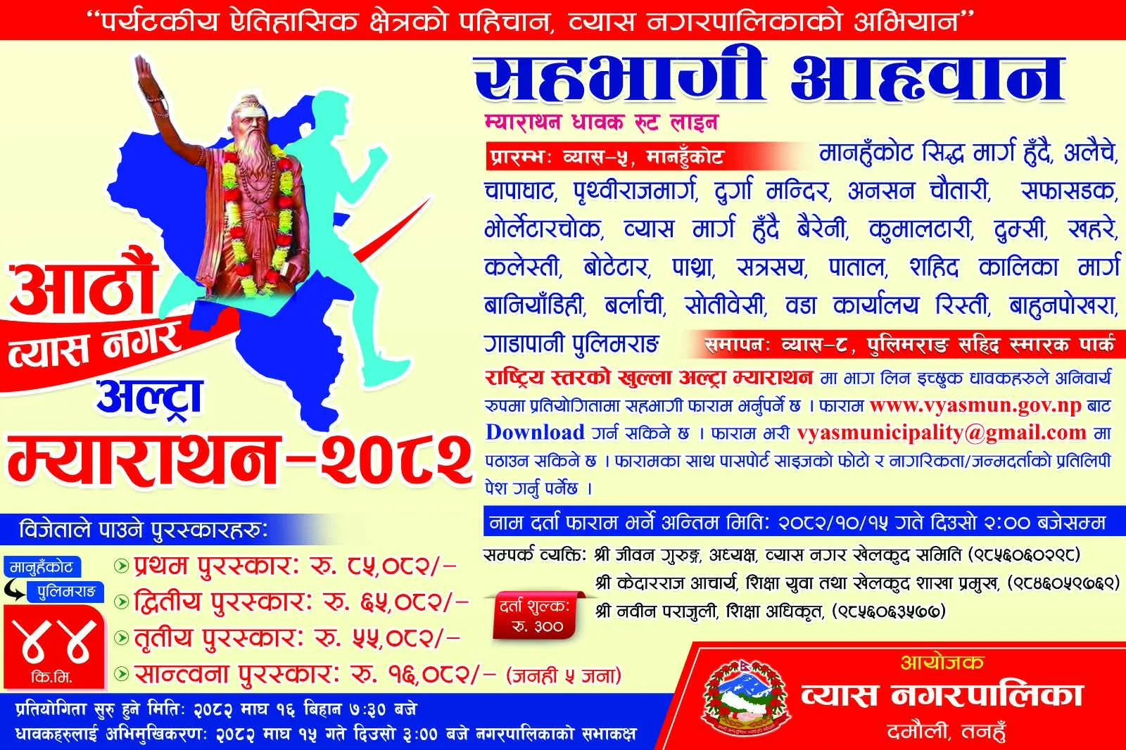 व्यास नगरपालिकाले शुक्रबार माघ १६ गते सहिद दिवसको अवसरमा ‘आठौं व्यास नगर अल्ट्रा म्याराथन’ आयोजना गर्ने भएको छ । ‘पर्यटन, धार्मिक एवं ऐतिहासिक क्षेत्रको पहिचान ः व्यास नगरपालिकाको अभियान’ नारासहित आज व्यास नगरपालिका–५ स्थित पर्यटकीयस्थल मानुङकोटबाट सुरु भइ व्यास नगरपालिका–८, सहिद गाउँ पुलिमराङ सम्मको अल्ट्रा म्याराथन गर्ने भएको हो ।