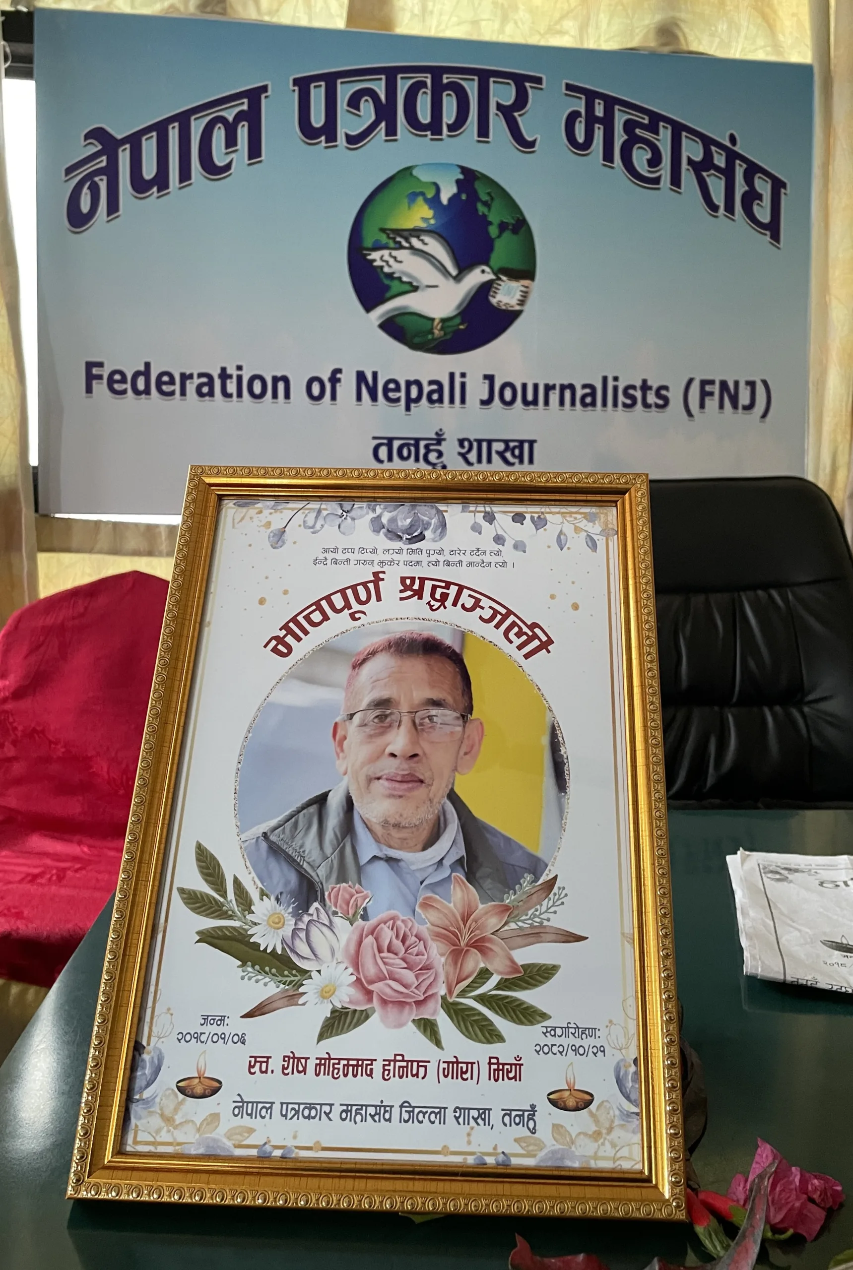 नेपाल पत्रकार महासङ्घ तनहुँ शाखाले पूर्व सल्लाहकार, नेपाल प्रेस युनियन तनहुँका अध्यक्ष शेष मोहम्मद हनिफ (गोरा) मियाँको स्मृतिमा एक लाखको अक्षयकोष स्थापना गर्ने घोषणा गरेको छ ।