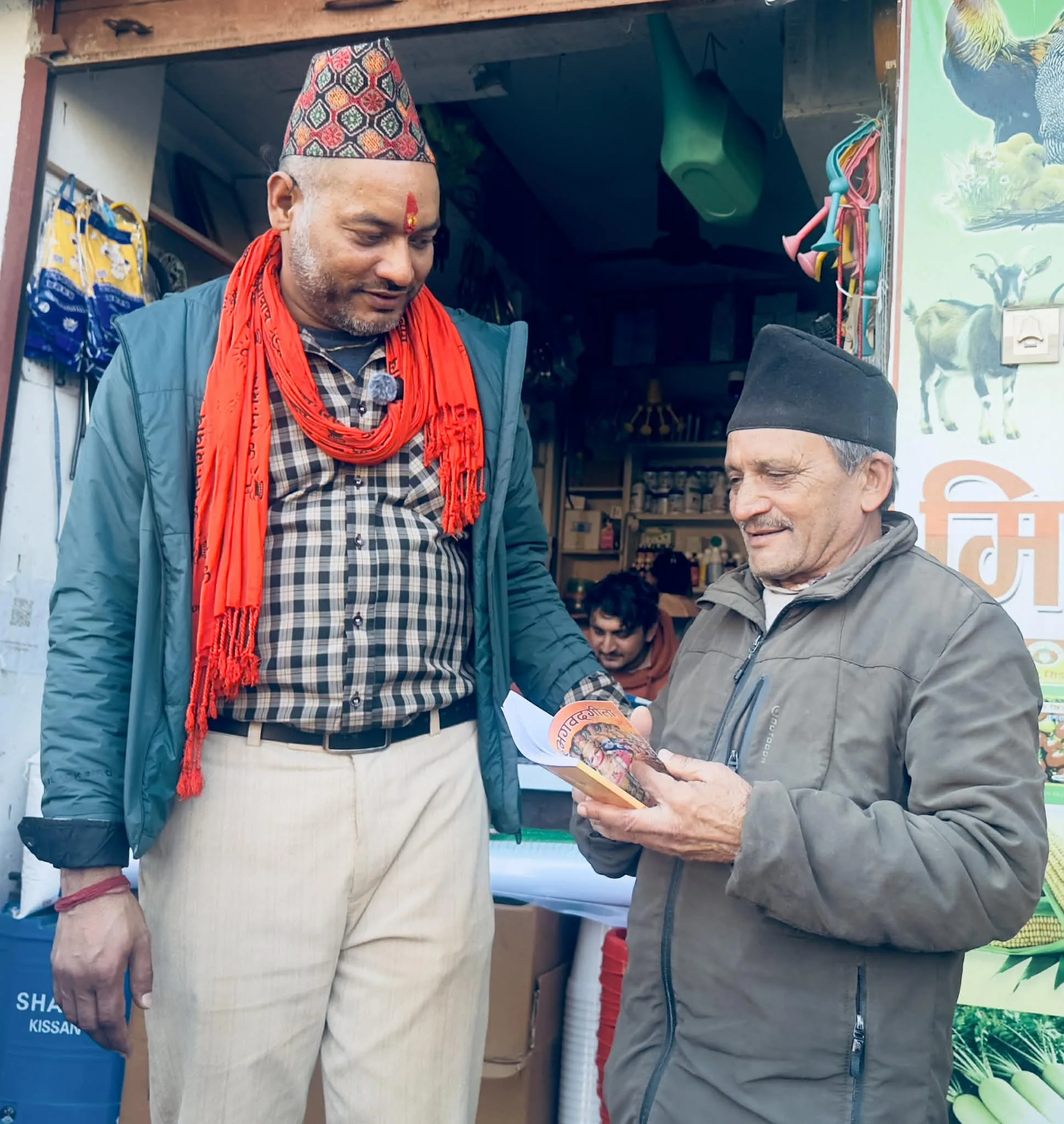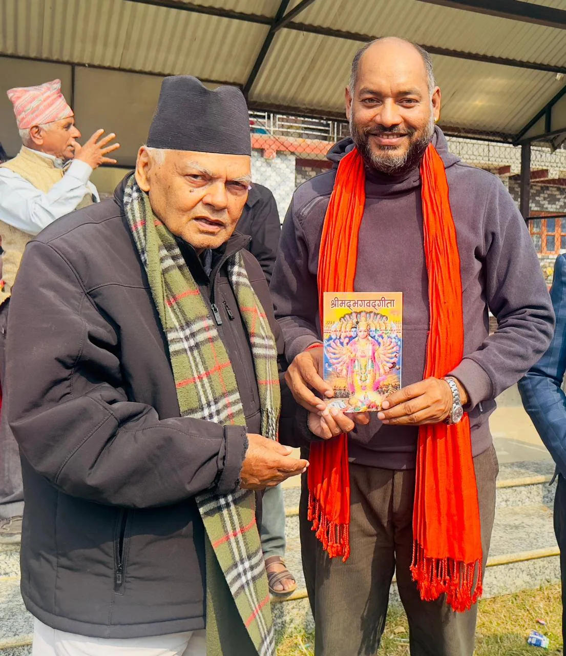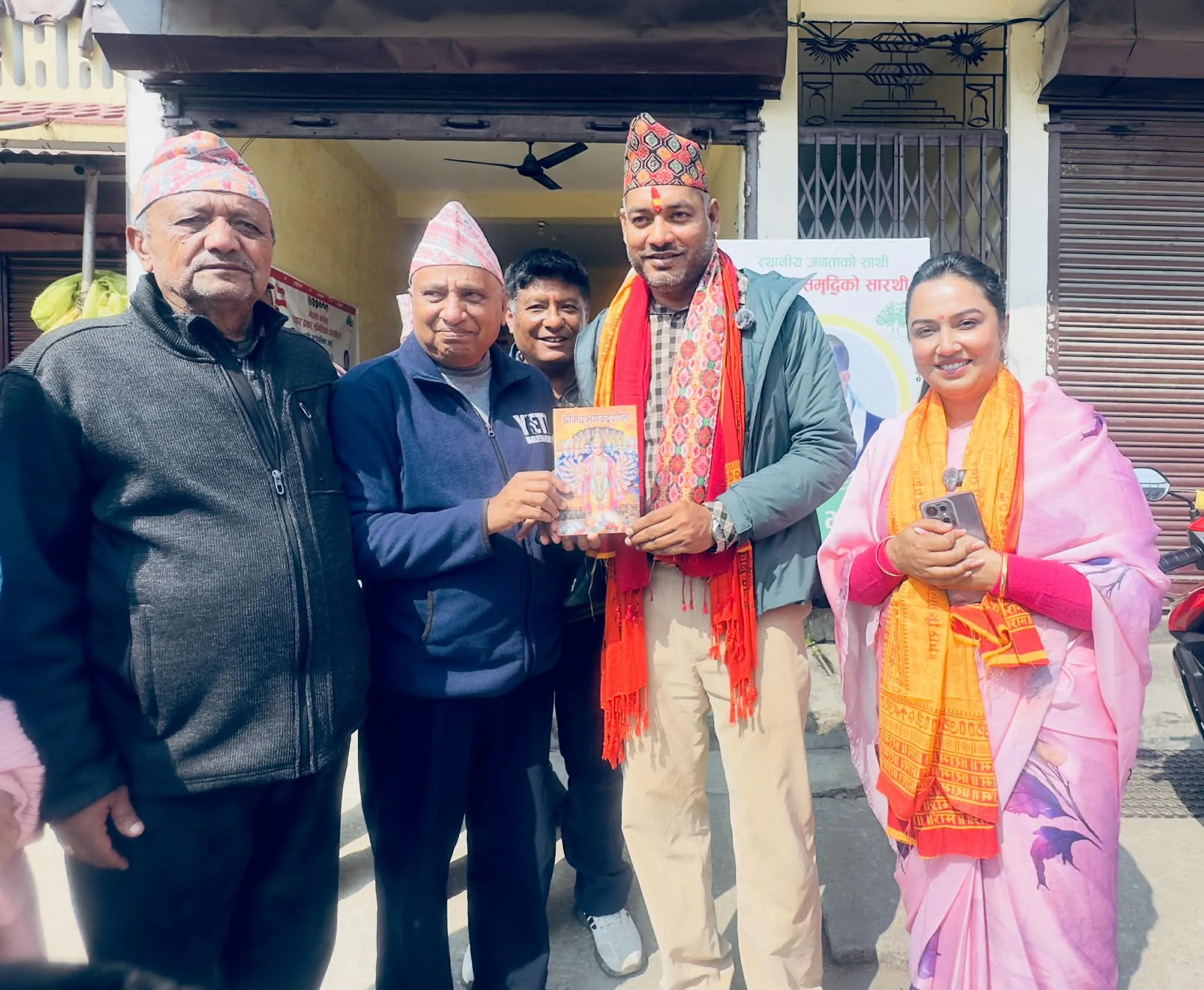 राष्ट्रिय प्रजातन्त्र पार्टीका उम्मेदवार अभिषेक जोशीले चुनावको प्रचारसँगै हिन्दु धर्मको पवित्र ग्रन्थ श्रीमद्भागवतगीता समेत वितरण गरिरहेका छन् । भागवतगीता वितरणका अभियन्ता समेत रहेका जोशीले चुनावी अभियानसँगै गीता वितरण कार्यलाई समेत अगाडी बढाईरहेका छन् ।