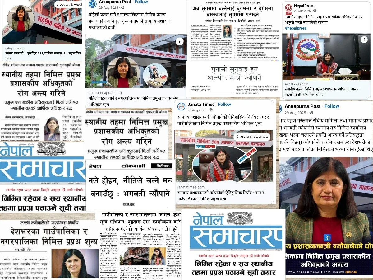 हालैको कुनै एकदिन संघीय मामिला तथा सामान्य प्रशासन मन्त्रालयकी सचिव चन्द्रकला पौडेलले निवर्तमान संघीय मामिला तथा सामान्य प्रशासन मन्त्री भगवती न्यौपानेलाई फोन गरेर ‘तपाईंले आफ्नो कार्यकालमा सुरु गरेको काम, नीति तथा निर्देशनका मुख्य बुँदाहरू सुझावसहित पठाउनुहोला’ भन्ने आग्रह गरिन् । मन्त्रीको रुपमा २०८२ साउन १ गतेदेखी भदौ २३ गतेसम्म संघीय मामिला तथा सामान्य प्रशासन मन्त्रालयको नेतृत्व गर्दा भगवतीले सुधारका ऐतिहाँसिक काम गरिन् । उक्त कामलाई हालको चुनावी सरकारका सामान्य प्रशासन मन्त्रीको समेत जिम्मेबारी सम्हालेका रामेश्वर खनालले पनि चासो लिएर अध्ययन गर्न चाहे । मन्त्री खनालको चासोपछि मन्त्रालयकी सचिव पौडेलले फोन मार्फत निवर्तमान मन्त्री न्यौपानेसँग उनले सुरु गरेका कामको बुँदा पठाउन अनुरोध गरेकी थिइन् ।