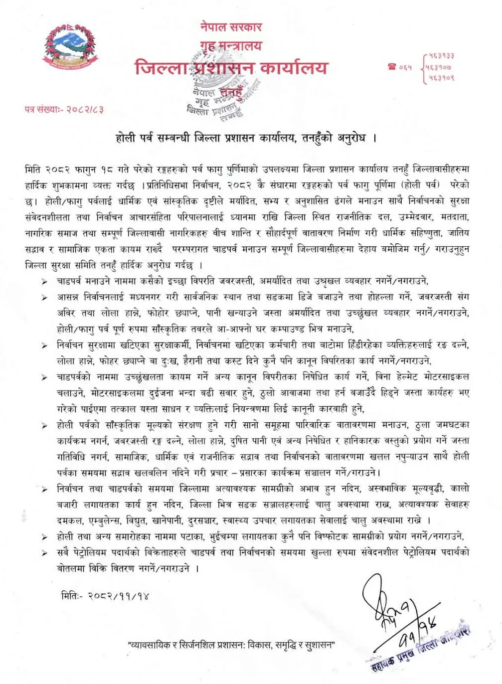 विहिबार सुचना प्रकाशन गरि जिल्ला प्रशासन कार्यालयले यहि फागुन १८ गते परेको रङ्गहरुको पर्व फागु पुर्णिमा (होली) धार्मिक एवं सांस्कृतिक दृष्टीले मर्यादित, सभ्य र अनुशासित ढंगले मनाउनका साथै निर्वाचनको सुरक्षा संवेदनशीलता तथा निर्वाचन आचारसंहिता परिपालनालाई ध्यानमा राखि जिल्ला स्थित राजनीतिक दल, उम्मेदवार, मतदाता, नागरिक समाज तथा सम्पूर्ण जिल्लावासी नागरिकहरु वीच शान्ति र सौहार्दपूर्ण वातावरण निर्माण गरी धार्मिक सहिष्णुता, जातिय सद्भाव र सामाजिक एकता कायम राख्दै परम्परागत चाडपर्व मनाउन सम्पूर्ण जिल्लावासीहरुमा अनुरोध गरेको हो ।